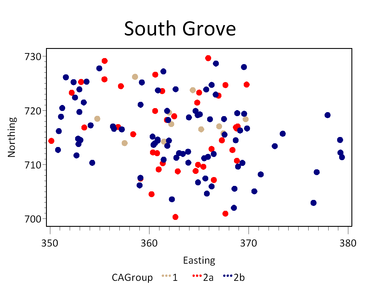 It is not clear what this synchronic variation represents. Possibilities include variation among different households or activity variation within a single household. What is clear is that this variation has no horizontal spatial expression within the excavated area: When the mean northings and eastings of the contexts were plotted by CA group, no spatial patterns emerged (Figure 6). If the assemblage came from different sources, they were dumped in the same place.
