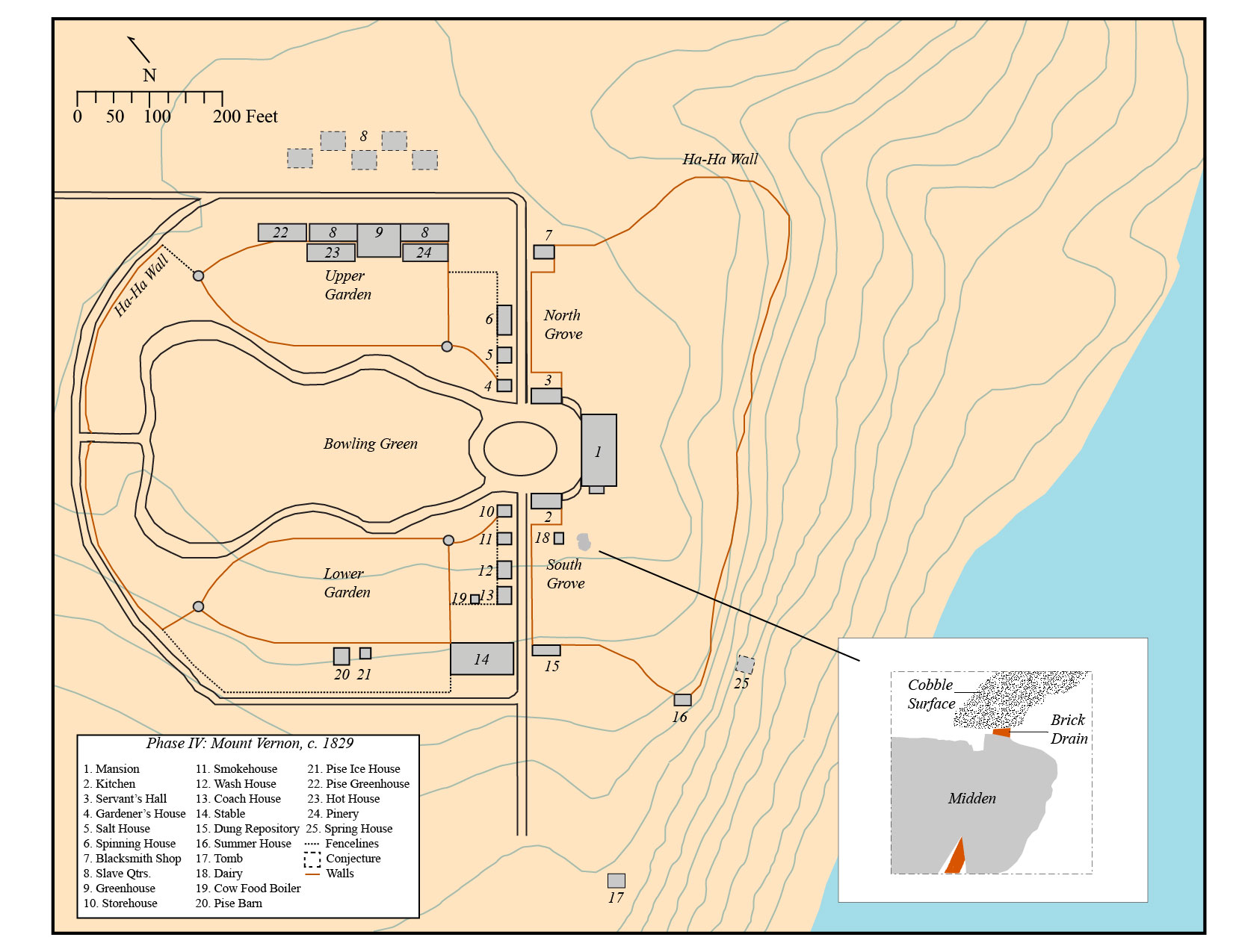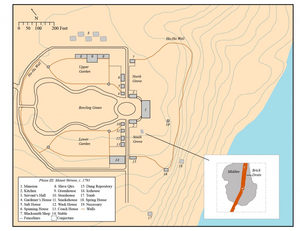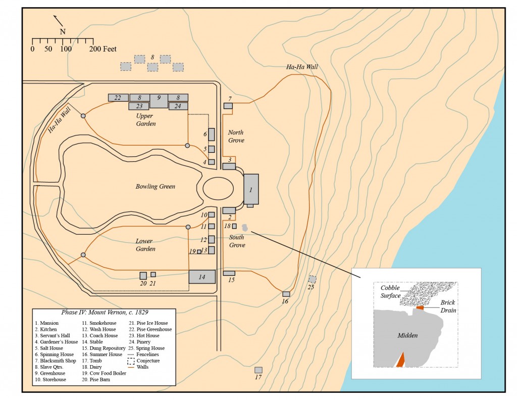 • The South Grove Midden site consisted of a 25 foot long by 20 foot wide refuse feature that was intruded by a large brick drain constructed ca. 1775 and by modern utilities and other disturbances. The refuse accumulated in a natural swale located south of Mount Vernon’s current Mansion and kitchen.