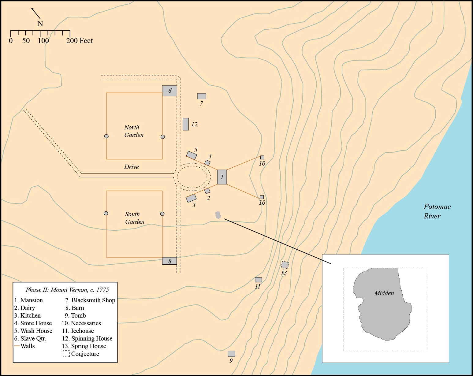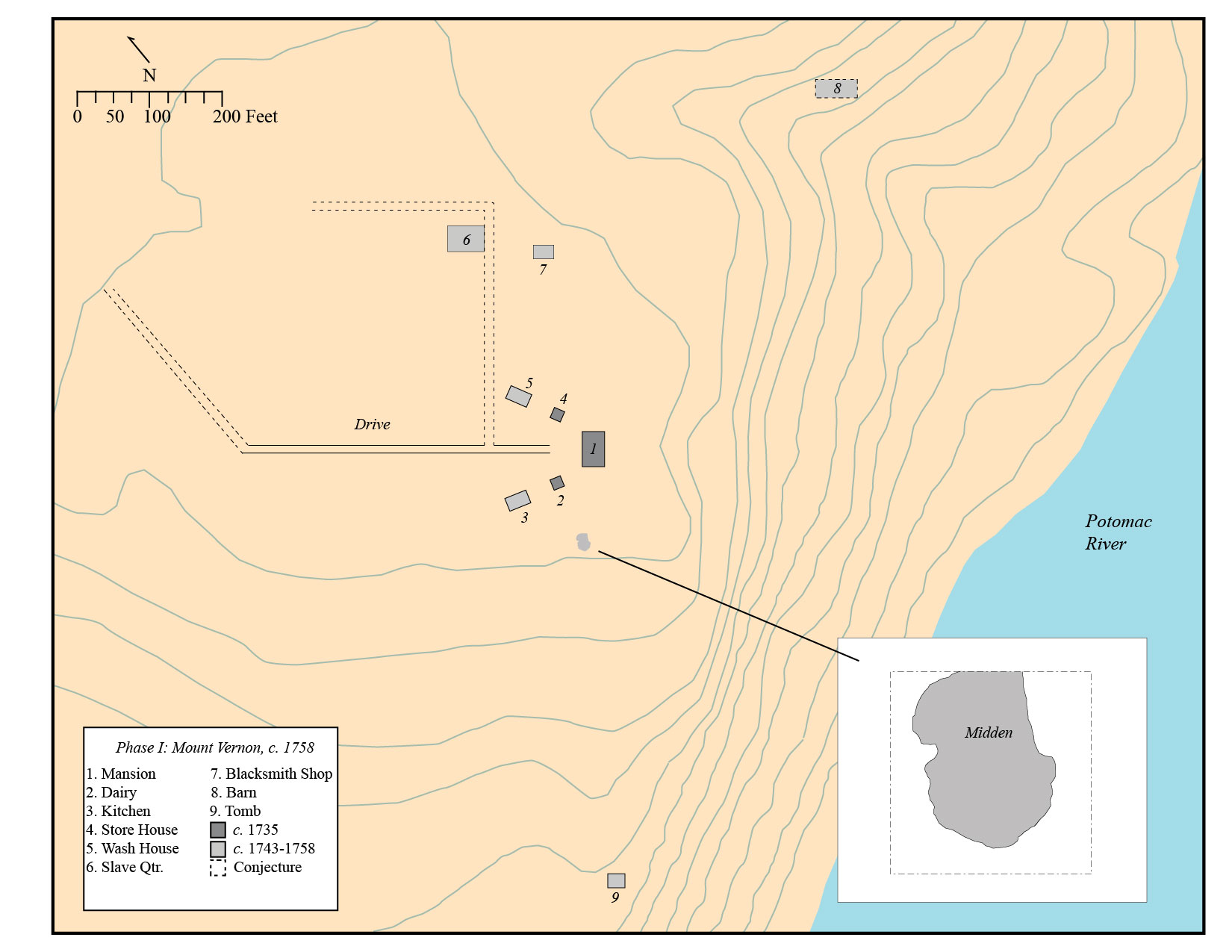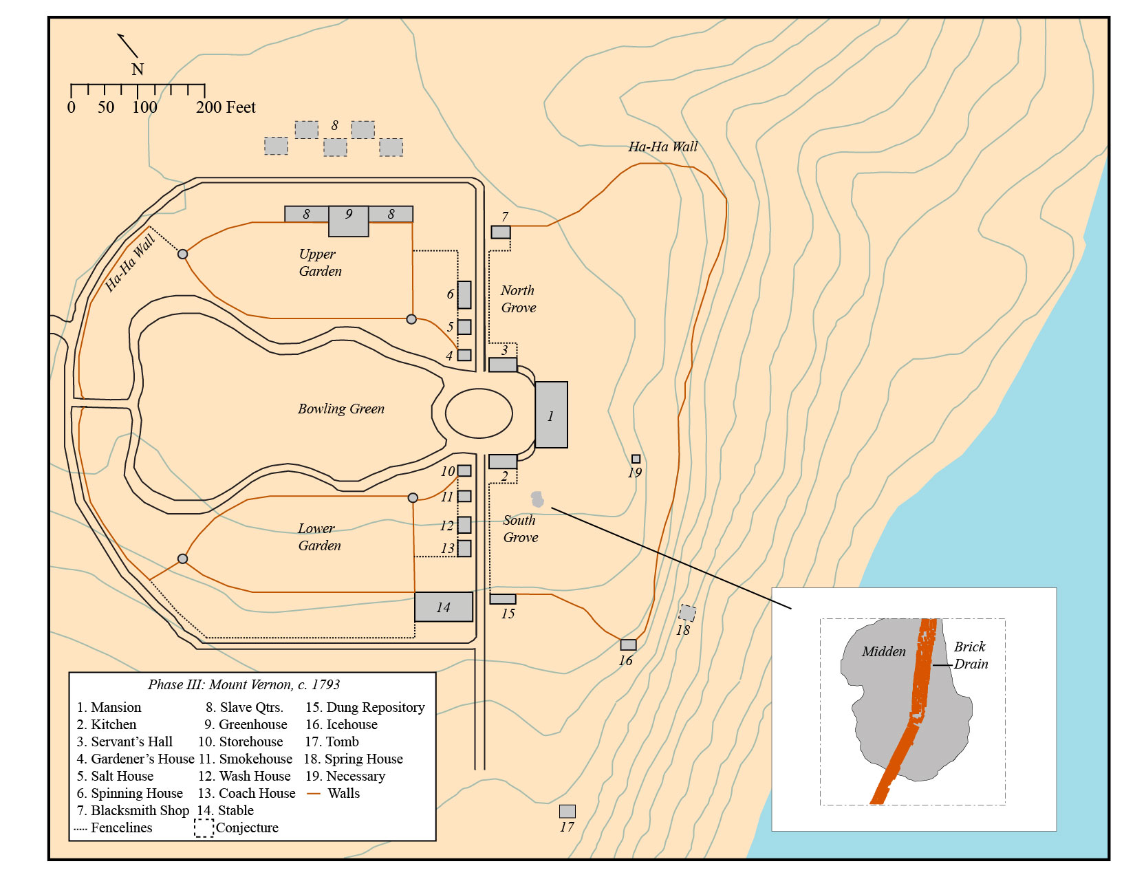• The South Grove Midden site consisted of a 25 foot long by 20 foot wide refuse feature that was intruded by a large brick drain constructed ca. 1775 and by modern utilities and other disturbances. The refuse accumulated in a natural swale located south of Mount Vernon’s current Mansion and kitchen.