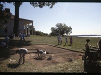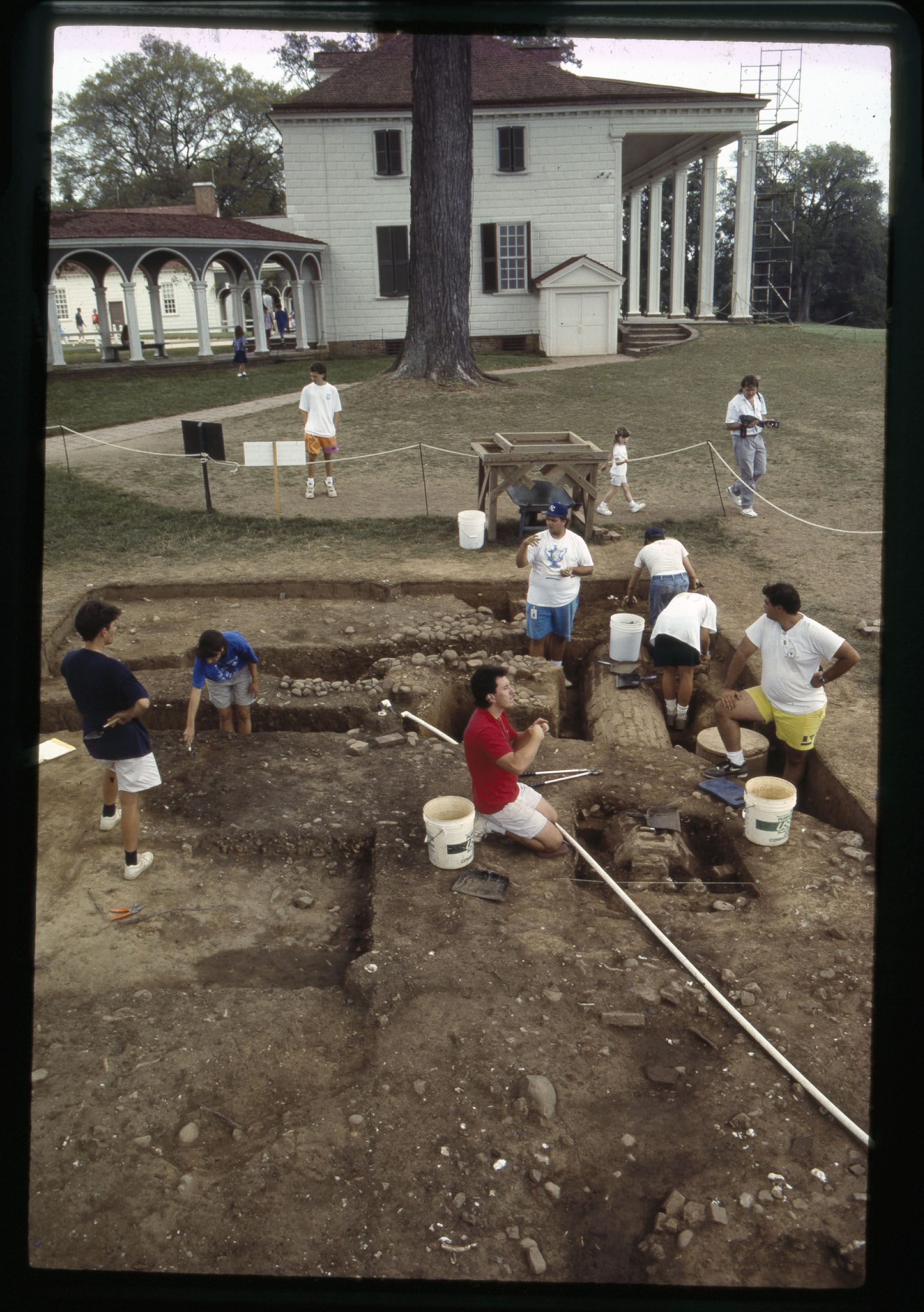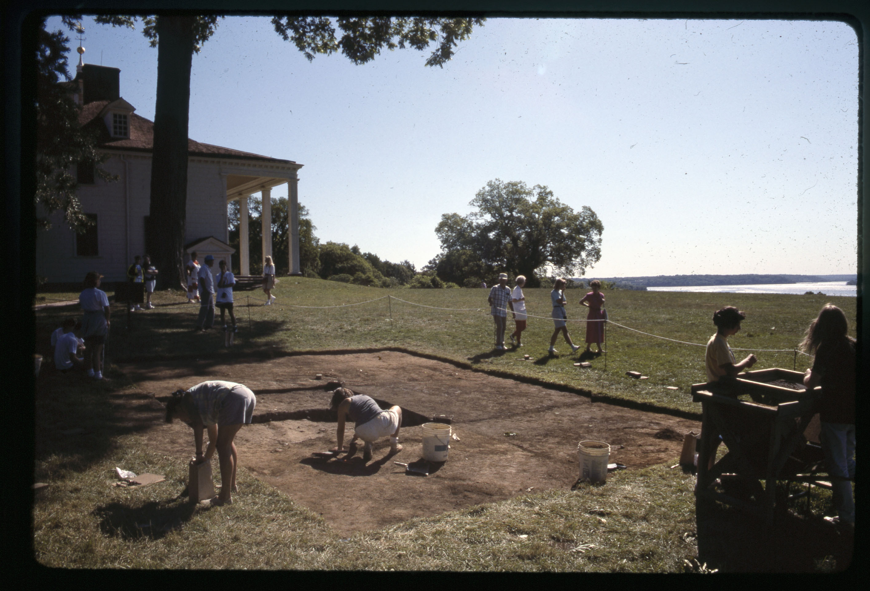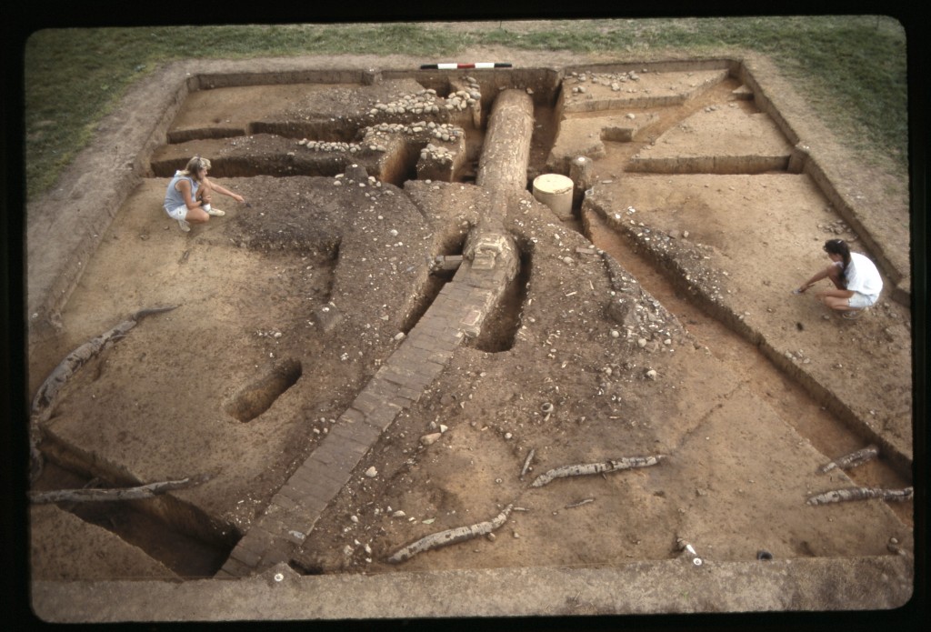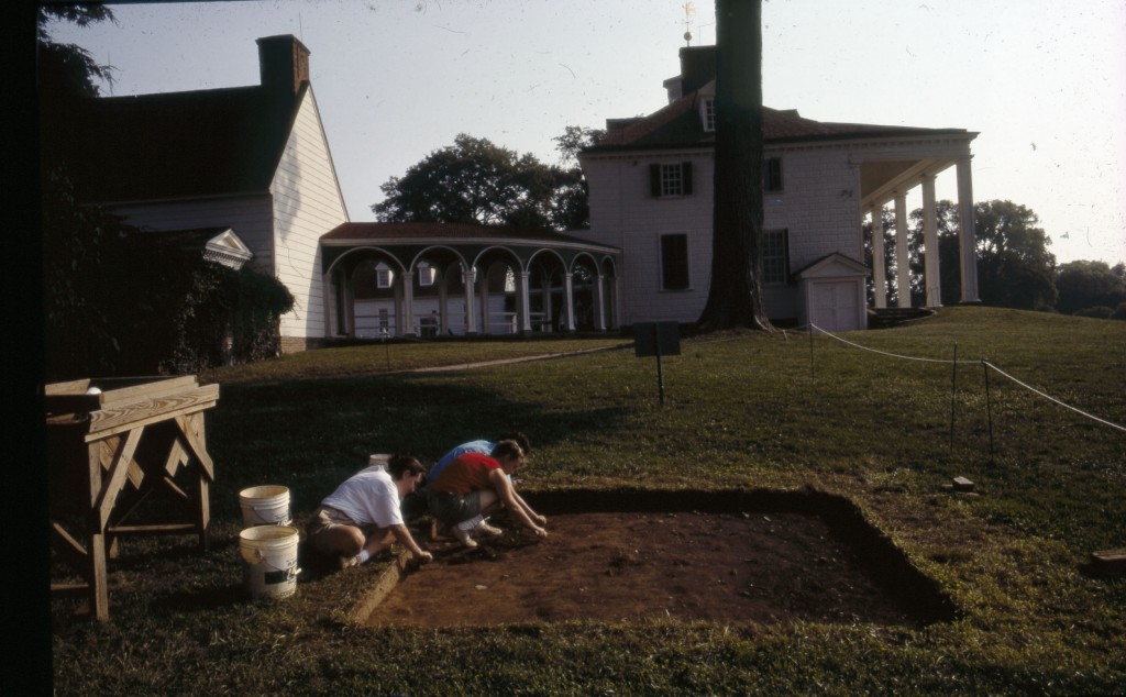 In 1948, members of the Mount Vernon grounds crew excavated a large hole in the area known historically as the South Grove, located 80 feet south of George Washington’s house, in order to plant a mature holly tree. Numerous artifacts dating to the eighteenth century were recovered, suggesting that the South Grove area contained midden deposits formed from the disposal of kitchen and Mansion refuse during George Washington’s lifetime. In the spring of 1990 during construction of an irrigation system in the South Grove, the grounds crew once again encountered eighteenth-century deposits while installing a sprinkler head. Later that summer, a 10×10 foot unit (328) was placed near the hole, beginning systematic study of the feature. During the summers of 1991, 1992, 1993, and 1994, excavations expanded to include an additional 8 units (308, 309, 310, 329, 330, 348, 349, and 350), fully exposing the midden and excavating the feature’s strata. Documentary, stratigraphic, and artifact evidence date the midden’s layers from ca. 1735 through the end of the eighteenth century.
