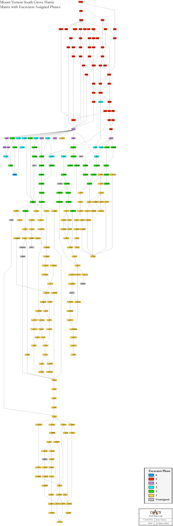 For a printable version of the Harris matrix based on Mount Vernon Excavator-Assigned Phases, download the Harris matrix [506 KB PDF].