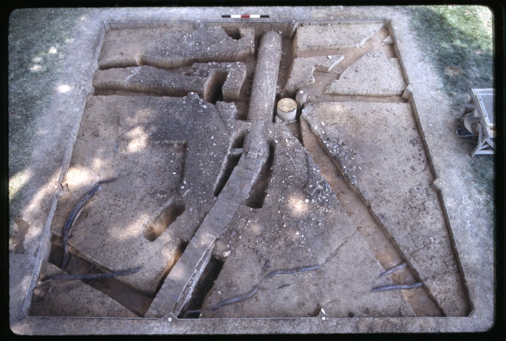 Throughout the 1770s and 1780s, George Washington renovated Mount Vernon (adding wings and the piazza), constructed outbuildings, and formalized the surrounding landscape. Most significant to the South Grove area was the replacement of the old dairy and kitchen with a new kitchen, the installation of a large, vaulted brick drain, and the transformation of the South Grove from workspace to formal landscape. By 1775, Washington had torn down Lawrence’s flanking outbuildings and built in their place a servant’s hall to the north and a new kitchen to the south (John Milner Associates 2004:20). The South Lane was reorganized, new outbuildings populated its western side, and fences were constructed to further demarcate space. Also in 1775, a series of brick-lined drains were installed under the basement floor to channel the rainwater away from the house and into a large, barrel-vaulted brick drain (uncovered in the 1991 field season). This tightly dated feature provides a solid terminus ante quem for the bulk of the midden’s deposits intruded by its builder’s trench. The following year, Washington wrote to his plantation manager his vision for the South Grove – to include plantings of ornamental species (Pogue, White, and Breen 2005). Washington described “that at the South, of all the clever kind of Trees (especially flowering ones) that can be got, such as Crab apple, Poplar, Dogwood, Sasafras, Lawrel, Willow (especially yellow & Weeping Willow, twigs of which may be god from Philadelphia)…” (Abbot 1988[6]:84).