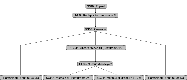 Stratigraphic groups, which represent multiple contexts, are identified on the diagram by their numeric designations (e.g. SG05), followed by the original excavator’s descriptions of them (e.g. “Plowzone”). Contexts that could not be assigned to stratigraphic groups are identified by their individual context numbers.