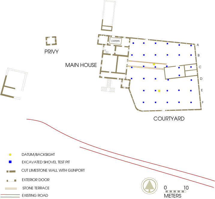 The first phase of construction resulted in a large, square house flanked by fortified towers on the northwest and southeast corners. The second phase of construction connected the towers to the main block, and includes the addition of a massive courtyard. The courtyard wall is over two and a half meters high, with broken 18th-century wine bottle sherds mortared into the top and 35 gun ports. The concern for security was carried over to a heavily fortified privy, complete with gun ports. Masonry rubble piles also suggest the location of stables and barns.