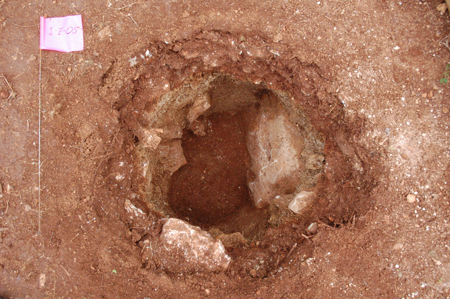 A total of 36 pits were excavated within the courtyard, including the datum and backsight pits. All STPs were 50 centimeters in diameter and all excavated sediment was screened through 1/4 inch mesh. In most cases, the pits were excavated to either subsoil, or bedrock. The exception was one pit on the F-transect (1-F-01), which was over 1 meter deep and could not be dug deeper due to the constraints of the pit’s diameter. Pits were not excavated outside of the courtyard in 2007.