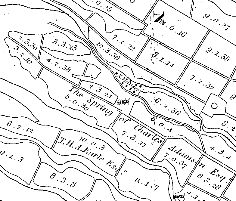 Detail of 1828 McMahon map showing slave village, windmill, and field associated with “The Spring of Charles Adamson, Esq.”