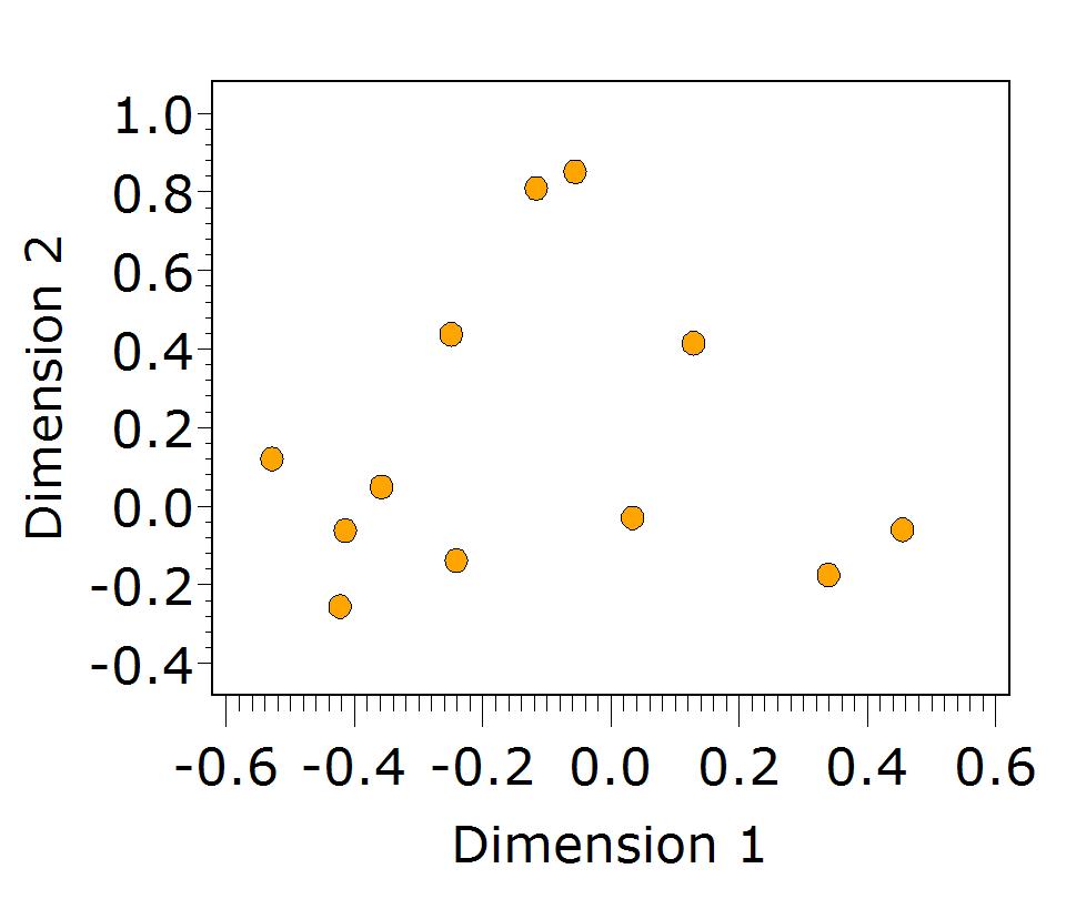 Figure 1. Plot of the 18 STP assemblages from The Spring village on the first two axes of CA. Points represent STP assemblages. Points that are close to one another have similar type frequency profiles.