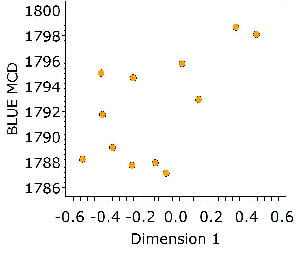 To infer a chronology from the STPs we used correspondence analysis (CA) of ware type frequencies. We employ CA because with the numbers of STP assemblages in the hundreds, a traditional manual frequency seriation is completely impractical. CA converts a data matrix of ware-type frequencies into a set on scores which estimate the positions of the assemblages on underlying axes or dimension of variation. MCD’s are weighted averages of the historically documented manufacturing date for each ware type found in an assemblage, where the weights are the relative frequencies of the types. Measuring the correlation between CA axis scores and MCDs offer an indication of whether the CA scores capture time (Ramenofsky, Neiman, and Pierce 2009).