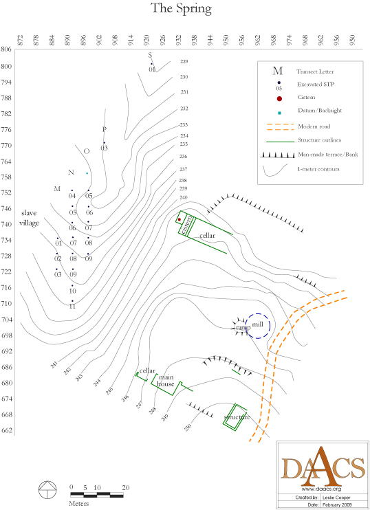 The 2004 survey was the starting point for the St. Kitts-Nevis Digital Archaeology Initiative, which is a collaboration among archaeologists from The International Slavery Museum (Philpott), The University of Southampton and Nevis Heritage Project (Leech and Morris), and DAACS (Galle, Neiman, Hudgins, Heath). In May 2008, archaeologists with SKNDAI and students from The University of Southampton’s archaeological field school conducted a one-day shovel-test-pit survey at The Spring’s slave village in order to confirm its location.