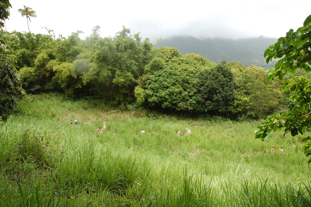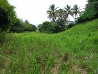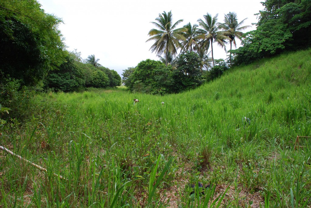 The slave village shown on the 1828 McMahon map was located in 2004. It lies in the base of a sloping valley. The windmill and sugar works are located east of the village, separated by a steep slope and accessed by a track. The southern edge of the village is defined by a steep earth bank with a ditch on its south side that channeled water from the plantation above. The western side is marked by a deep and steep-sided ghut while the eastern edge is defined by a steep slope up to the works. The interior of the valley gently slopes towards the north. To the north are cultivation ridges and the northern limit of the village is marked on McMahon’s map of 1828.