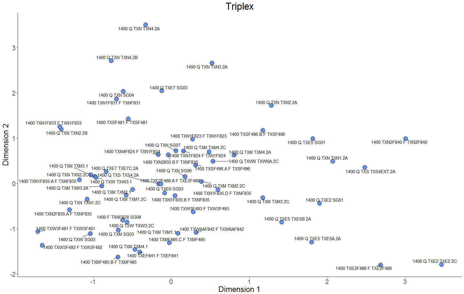 As with other sites in the Archive, the seriation chronology for the Triplex was derived from ceramic assemblages of stratigraphic groups, feature contexts, and individual stratigraphic layers not assigned to a stratigraphic group. Ceramic data comes from unit contexts excavated within and outside of the foundation walls. To reduce the noise introduced by sampling error, only ceramic assemblages with more than five sherds were included. We excluded assemblages from unit clean-up and surface collections. The seriation chronology presented here is the result of a correspondence analysis (CA) of ware-type frequencies from contexts that meet these requirements (Figures 1 and 2).