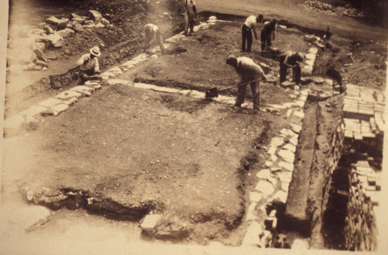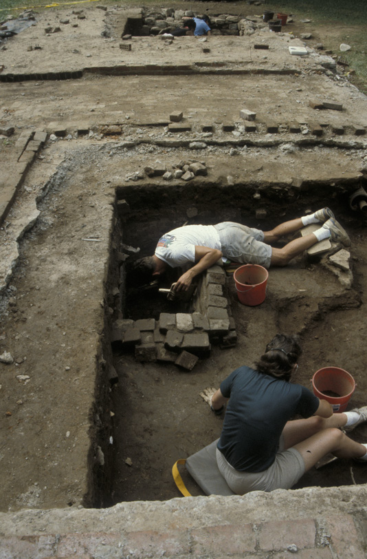 Located directly behind the Jackson mansion, the building referred to archaeologically as the Triplex was a three-bay brick dwelling with cut limestone foundations measuring 60 feet by 20 feet. In the 1930s, the Works Progress Administration (WPA) constructed a brick museum building with a stone foundation and a concrete floor overtop of the original structure. Photographs from the construction show chimney base remnants on the gable ends of the structure, as well as one midway along its length, which indicate that each 20 x 20 foot unit had its own chimney. No evidence for communicating doors was found during excavations; it was likely that each unit had a single door to the exterior.