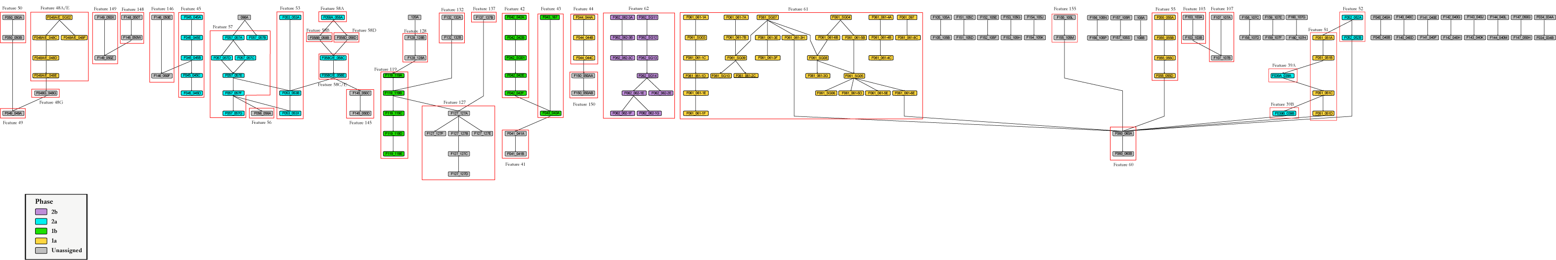 The stratigraphic relationships among stratigraphic groups, unassigned contexts, and features are summarized in the Harris Matrix for the site. Phase assignments from the seriation are shown on the Harris Matrix in color, facilitating comparison of the seriation chronology and the stratigraphic chronology of the site.