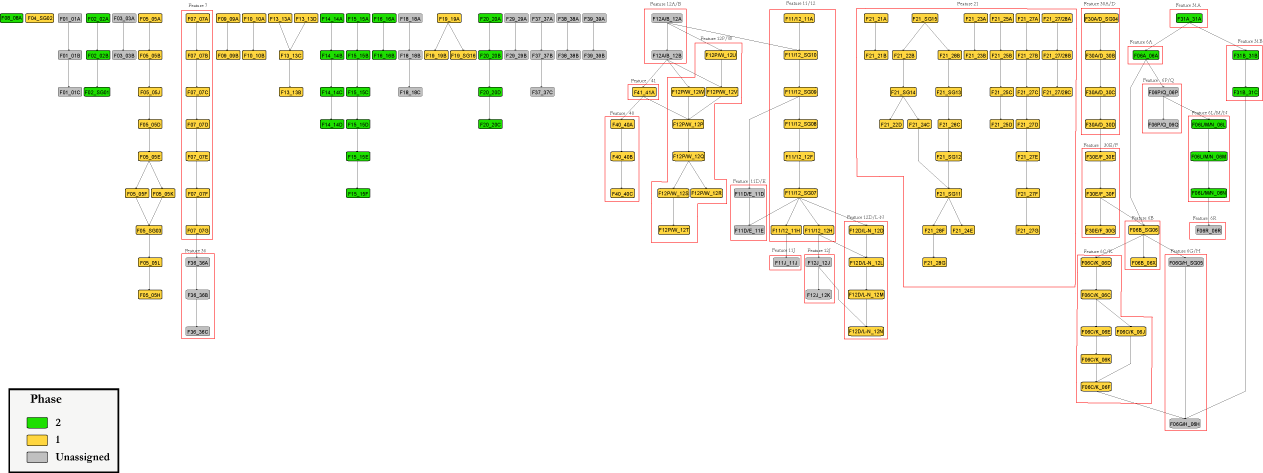 The stratigraphic relationships among stratigraphic groups, unassigned contexts, and features are summarized in the Harris Matrix for the site. Phase assignments from the seriation are shown on the Harris Matrix in color, facilitating comparison of the seriation chronology and the stratigraphic chronology of the site.