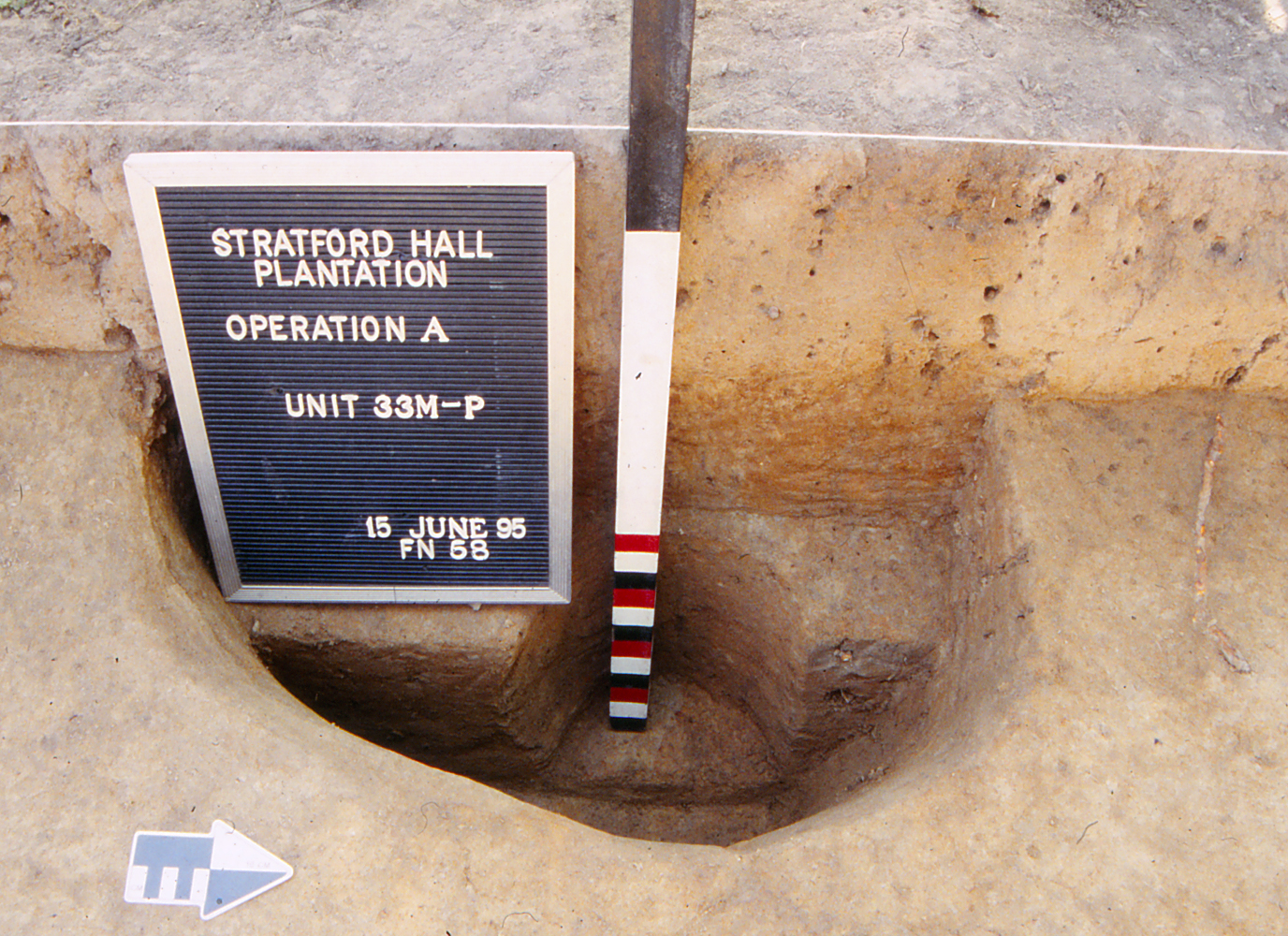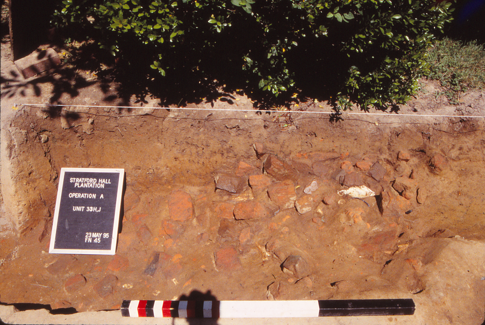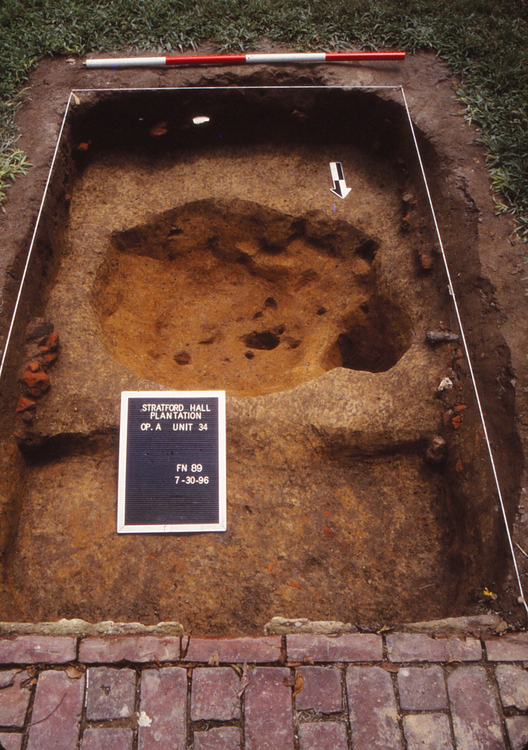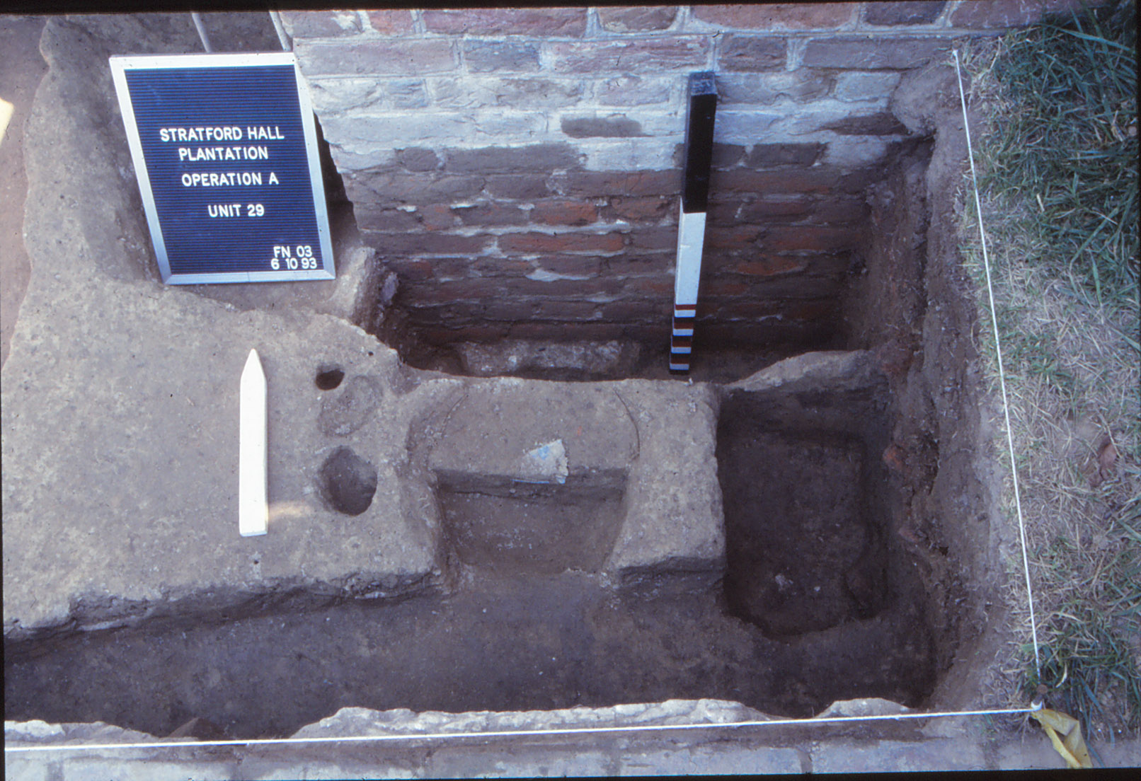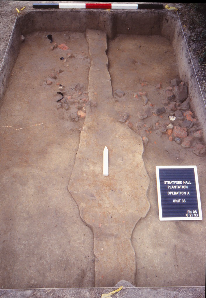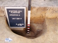 Placed in predictive fashion, UMW Unit 35 (Figure 6) rests on the extension of the Great House’s central (east-west) axis line in the area just west of a large English walnut tree (Sanford n.d. Chapter 3, pages 4-5; Sanford 1993:8-9). Here archaeologists sought indications of either a central walkway into the West Yard, or a landscape element or division that respected this potential design line. Instead, only limited evidence for Lee period features came to light. A dense artifact concentration dominates the upper portion of Unit 35 and contains a mixture of modern materials (those of the early-twentieth century and restoration era) and items from the nineteenth century. While the lack of landscape features was disappointing, the artifact assemblage within the higher strata forms a basis for looking at occupation of the Great House during the post-Lee ownerships at Stratford. A few artifacts of the eighteenth century and prehistoric era occur within the upper layers as well. Beneath these fills, archaeologists did uncover one posthole (F04), but this feature was not associated with dateable evidence and could originate from either the post-Lee period or the eighteenth century. Drawing on other possible associations, the posthole is similar to those found adjacent to the west steps of the Great House during the 1992 UMW testing, but the exact manner of their possible relation is not clear. Additionally, the posthole may form part of the north-south fence line/division scheme proposed to exist between the Northwest and Southwest Outbuildings based on evidence at the extant outbuilding and within the Innocenti bed test squares.