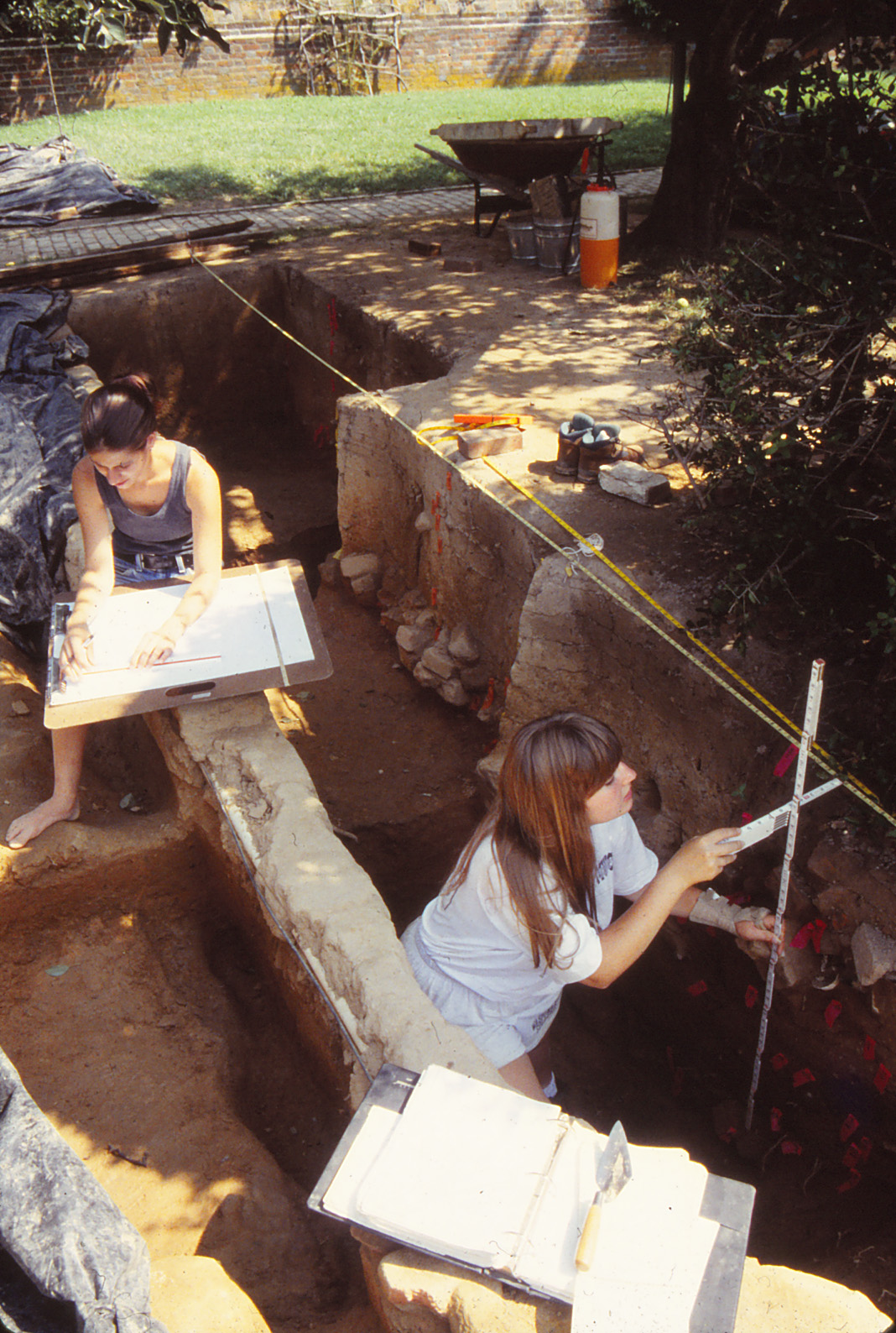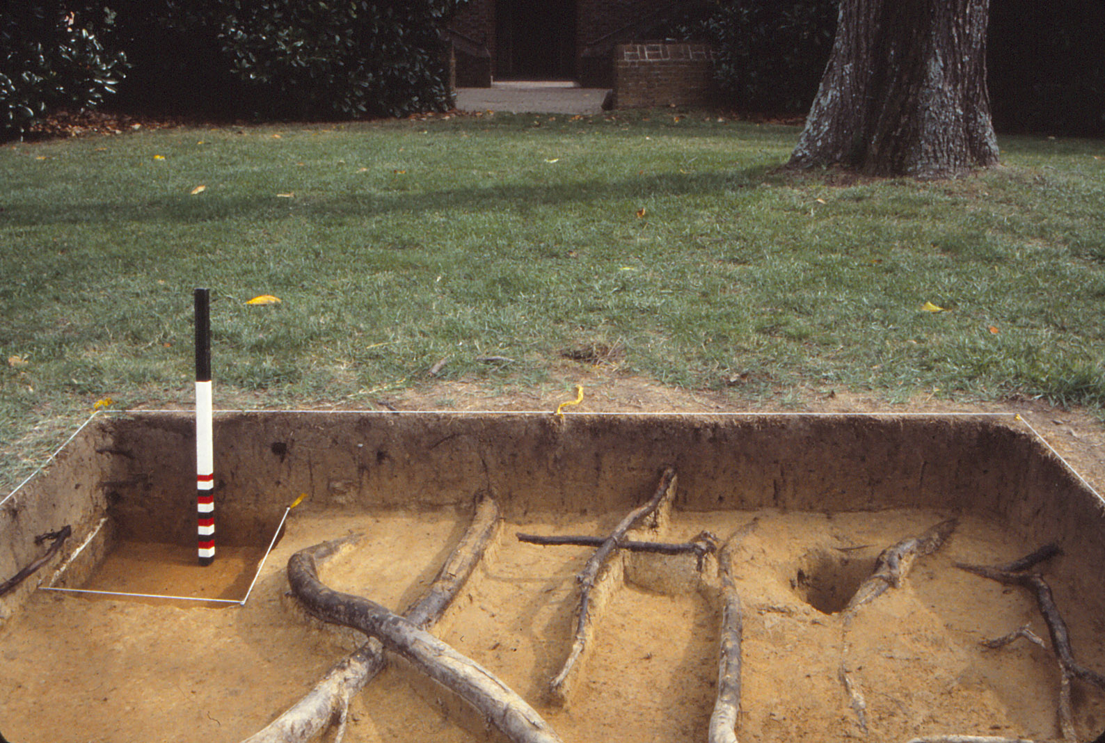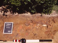 The large kitchen garden beds facilitated archaeology in this portion of the West Yard by acting as small plowed fields that enabled the excavation of several ten-foot squares within their boundaries (Figure 5). Excavations here generally revealed a consistent stratigraphic sequence (about one foot in depth), with the modern organic fill of the garden beds overlying the surviving portion of the 1940s plowzone, followed by one or two natural soil zones, including the orange clay subsoil (Sanford 1993:4-5, 1994:5-6). Modern gardening features, such as bean pole impressions, planting trenches, and spade divots, were identified, given proveniences, and excavated separately so that these recent intrusions and associated artifacts (e.g., plastic, modern terra cotta pottery, bottle glass, etc.) would not be confused with any features surviving from previous periods. Smaller test cuts were excavated within certain 10-x-10 foot units to investigate deposits. Many of these modern gardening features were entered as “unnumbered features” in DAACS.