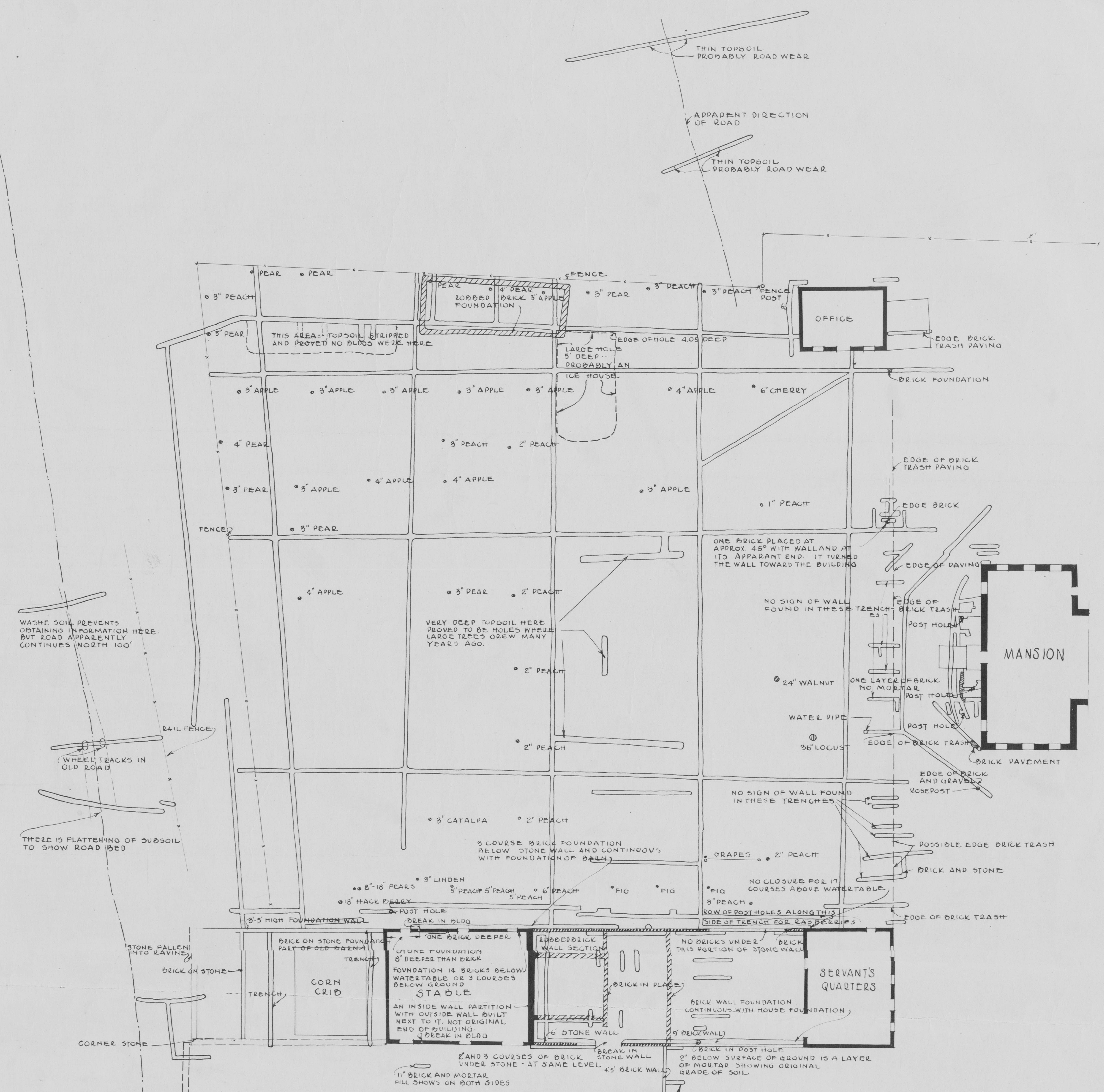 From 1932 to 1934, Morley Williams, also a landscape architect, led trenching work in the eastern and western portions of the areas surrounding the Great House (Morley 1934). Approximately 20 trenches running north-south and east-west were dug at the edges of the area west of the Great House (Figure 3). More extensive trenching focused on the area immediately east of the Great House known as the East Garden.