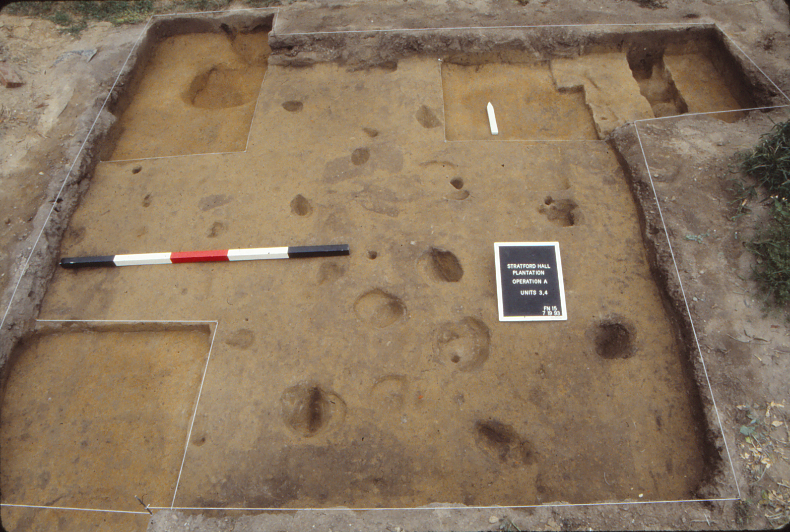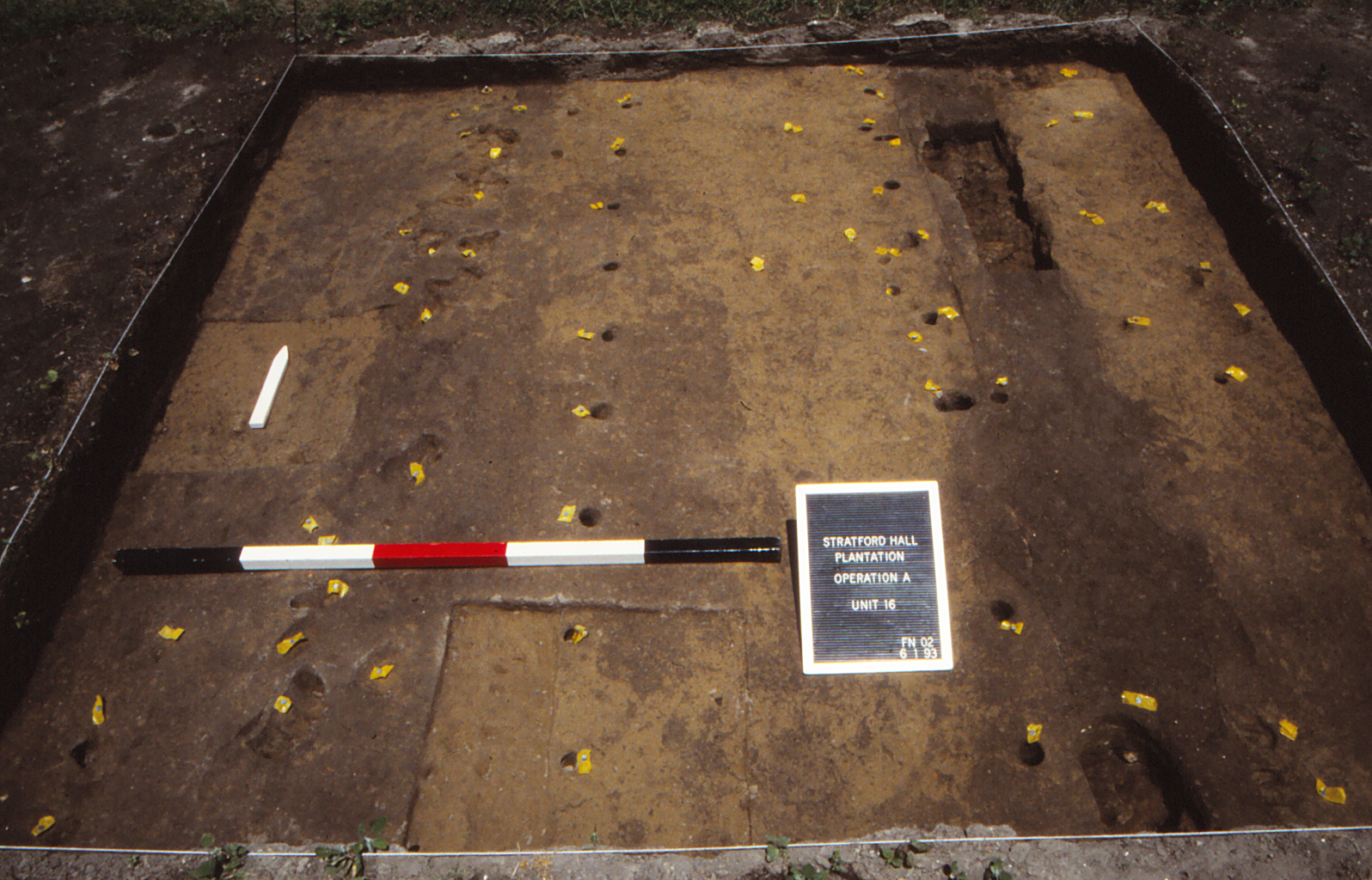 The University of Mary Washington conducted archaeological field schools at Stratford Hall for seven consecutive seasons between 1993 and 1999 under the direction of Dr. Douglas W. Sanford (Sanford n.d. Chapter 3; Sanford 1993, 1994, 1995, 1996, 1997; Smith, Andrews and Sanford 1998). Lacking detailed landscape documents at Stratford, archaeologists relied on a three-pronged field strategy for the West Yard. First, excavations targeted the locations and features of particular interest identified by either the archaeological testing of the 1930s or 1970s. Second, by applying knowledge of plantation organization and eighteenth-century landscape design from comparative historical and archaeological sources, staff members predicted the locations for specific design elements and landscape divisions or barriers. Third, given the objective of sampling the West Yard as a whole, but with larger units that would allow better observation of features and the spatial relations between them, archaeologists predominantly used ten foot squares as the basic excavation unit, and distributed these units across the operation area (A). The following paragraphs provide a summary of excavations grouped by areas of investigation. All of the information from field records and artifact data are available in DAACS.