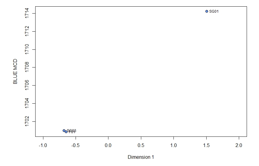 Analysis of Feature 1’s stratigraphy by DAACS staff identified five stratigraphic groups (SGs), which were interpreted as five different fill layers within the feature (see Harris Matrix). However, the ceramic assemblage sizes were too small (< 5 sherds) to calculate Mean Ceramic Dates for SG02, SG04, and SG05. A plot of the Dimension 1 scores against BlueMCDs for the remaining SGs and Feature 1 contexts (Figure 13) indicates that there is temporal variation between SG01 (BlueMCD 1714) and SG03 (BlueMCD 1701) and between SG01 and the rest of the contexts associated with Feature 01 (BlueMCD 1700) that have not been classified into stratigraphic groups. A closer look at assemblage composition indicates these differences are due to greater amounts of delftware in SG03 contexts while British Stoneware and White Salt Glazed Stoneware are the primary ware types comprising the SG01 assemblage and Post-Medieval London-area Redware predominates the rest of the Feature 01 contexts. These results support Sanford’s conclusion that the pit had different phases of use, but it is not clear whether the phases revealed by the correspondence analysis align with the ones outlined by Sanford. Moreover, because excavations to date have not revealed the full east-west extent of the pit, it is difficult to say with certainty what function it could have served. It is possible that future work will provide more information.