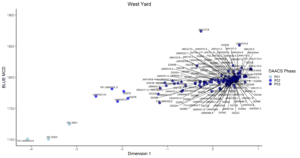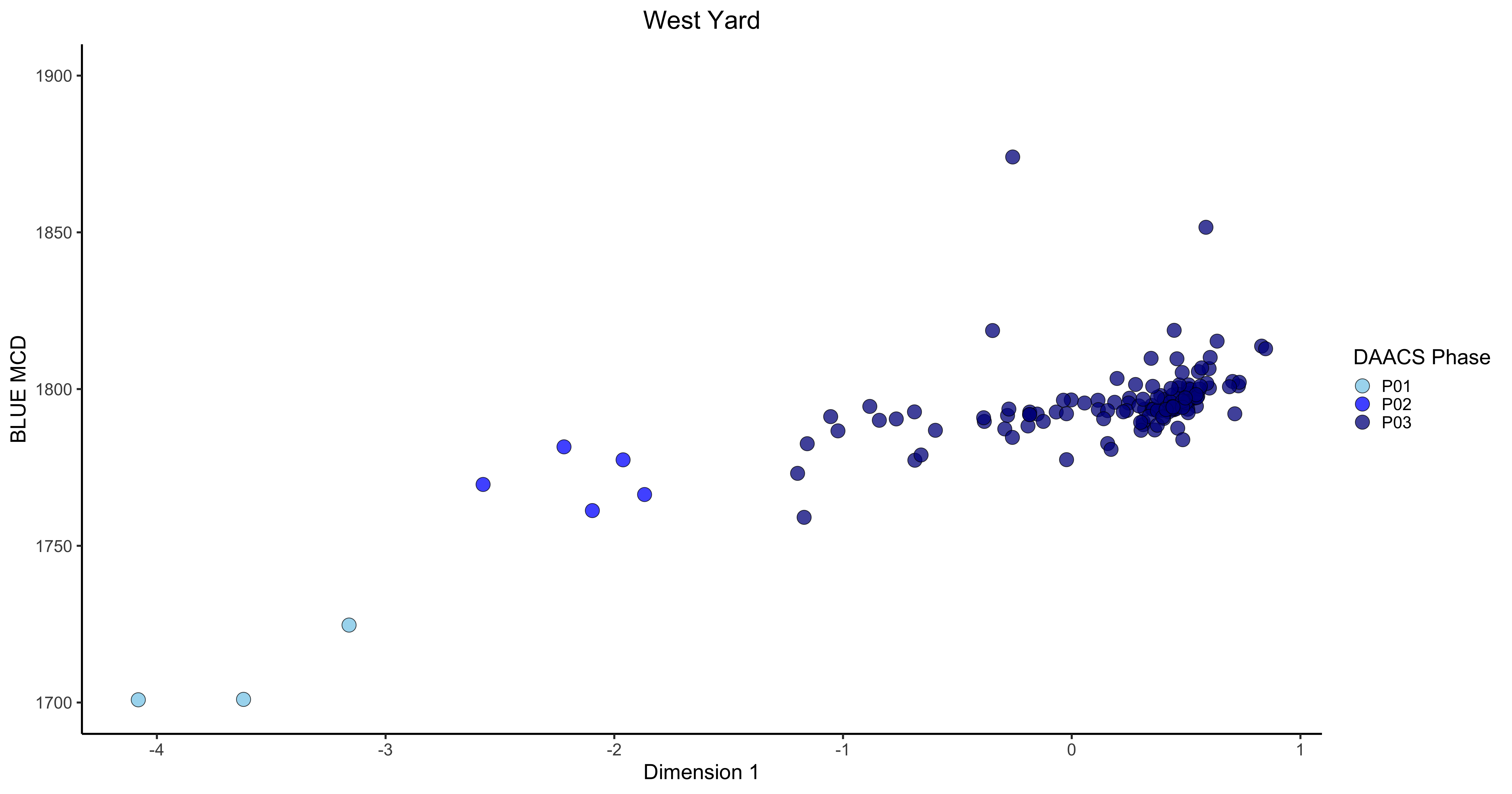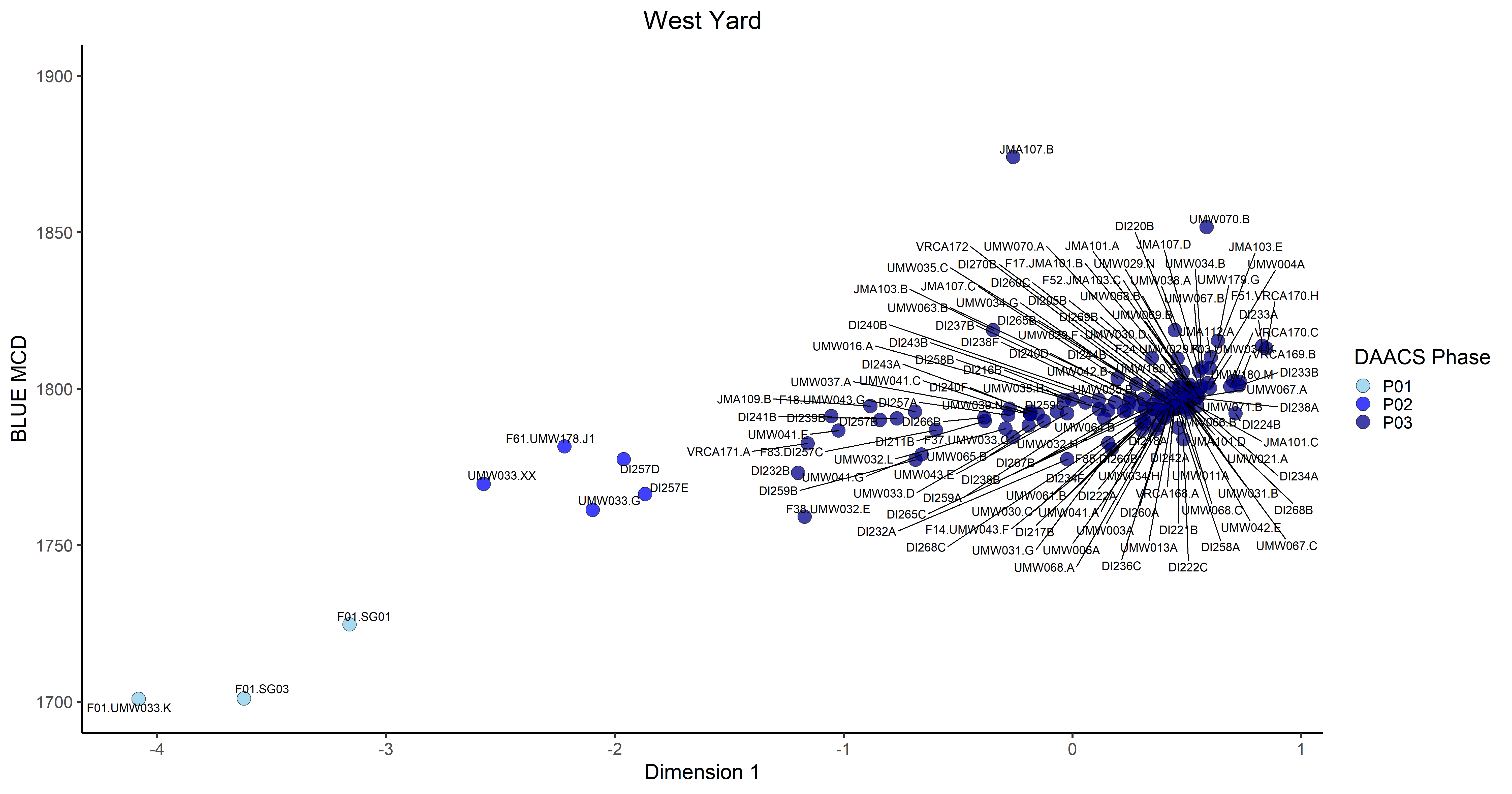 DAACS Phases are groups of assemblages that have similar correspondence-analysis scores, similar MCDs, or both, and are therefore inferred to be broadly contemporary. Phases have a P-prefix that precedes the phase number (e.g. P01 equals Phase 1). Based on the correspondence analysis DAACS divided the West Yard occupation into three phases (Figures 4 and 5).