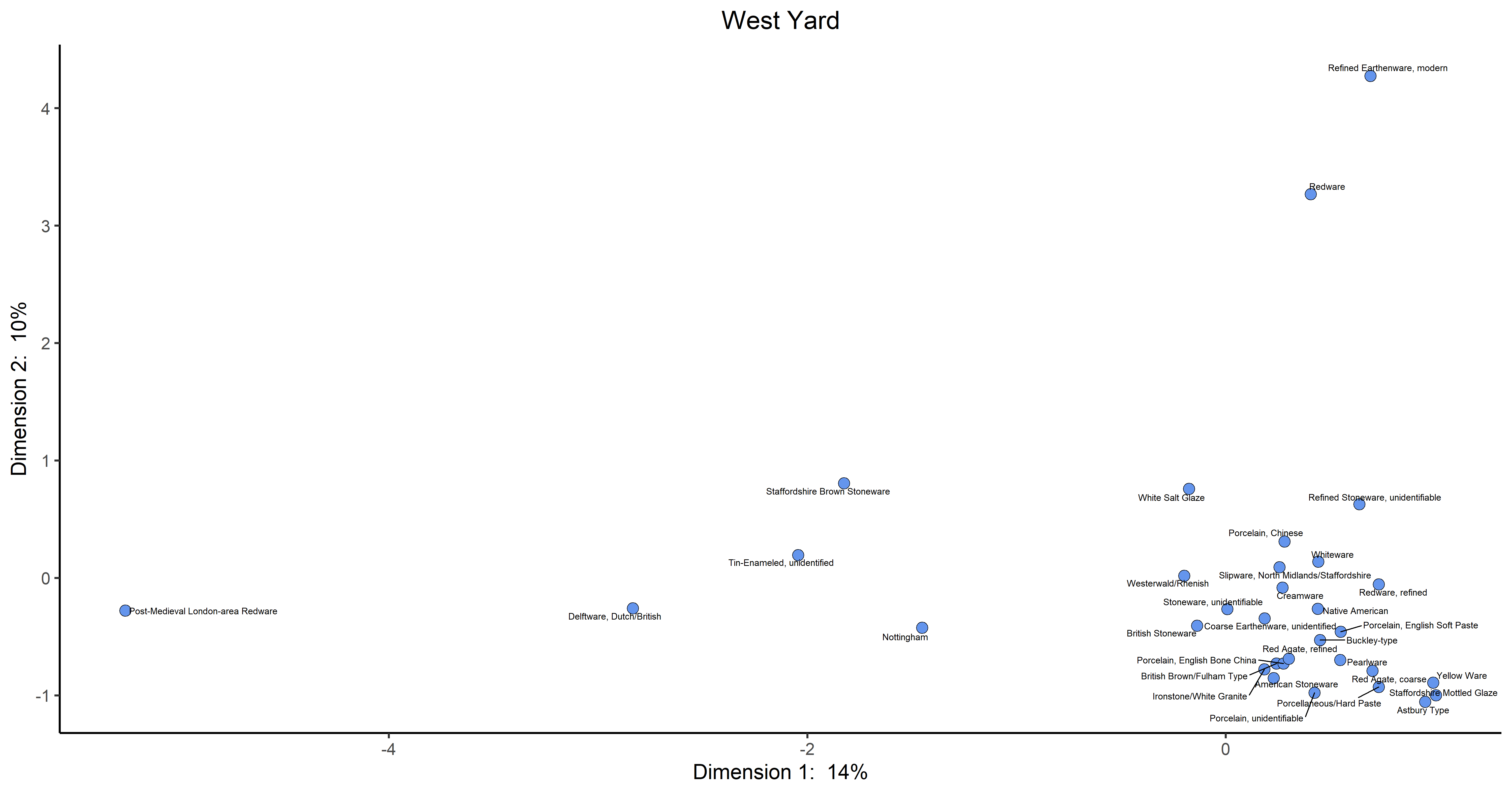 As with other sites in the Archive, the seriation chronology for West Yard was derived from ceramic assemblages aggregated at the level of stratigraphic groups and individual contexts not assigned to stratigraphic groups. To reduce the noise introduced by sampling error, only ceramic assemblages with more than five sherds were included. We excluded assemblages from unit clean-up and surface collections. The seriation chronology presented here is the result of a correspondence analysis (CA) of ware-type frequencies from contexts that meet these requirements (Figures 1 and 2).