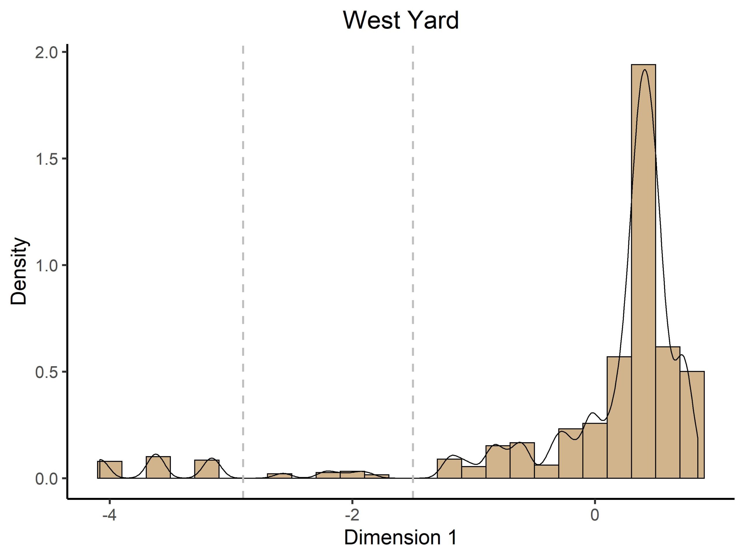 Figure 3. Histogram of ceramics from West Yard plotted along CA Dimension 1. The vertical lines indicate DAACS phase divisions.