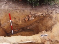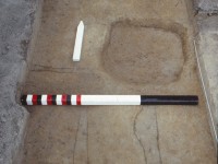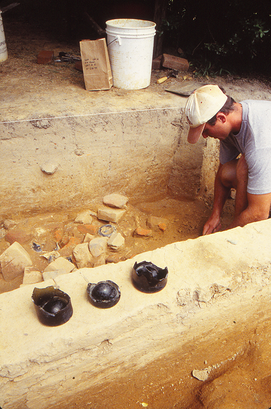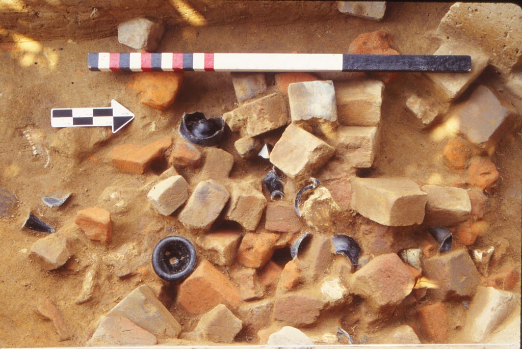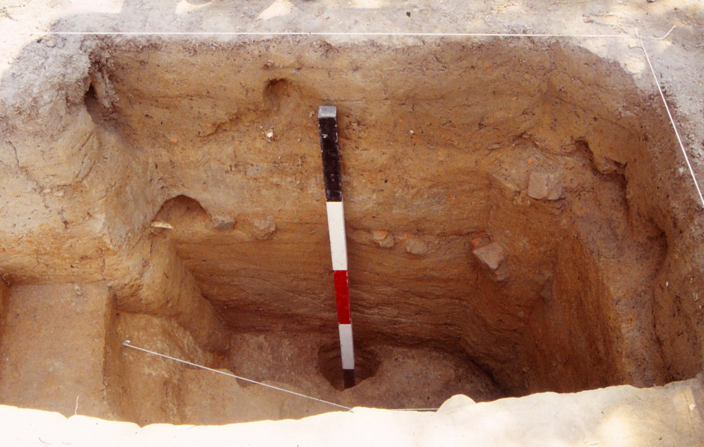 Sanford noted that while roughly rectangular and of the dimensions discovered in the 1930s, the borrow pit’s actual plan and profile outlines are not so uniform. He notes that the overall north-south profile developed by the field school test units revealed a shallow slope on the south end that contrasts with the north side’s steeper incline and suggests that the clay extraction process proceeded in a south-to-north direction. Additionally, the pits’ western edge is somewhat irregular, broken in places by what appear to be smaller, subsidiary pits. In addition, two large (~8 inches in diameter) postholes (Features 44 and 45 in DAACS) discovered on this western side of the pit may represent posts for covering the pit with a tarp or rough wooden roof, or possibly for a hoist arrangement (recorded in DAACS as Feature Group (FG) 05). Finding additional postholes on other sides of the borrow pit would clarify the accuracy of these speculations.