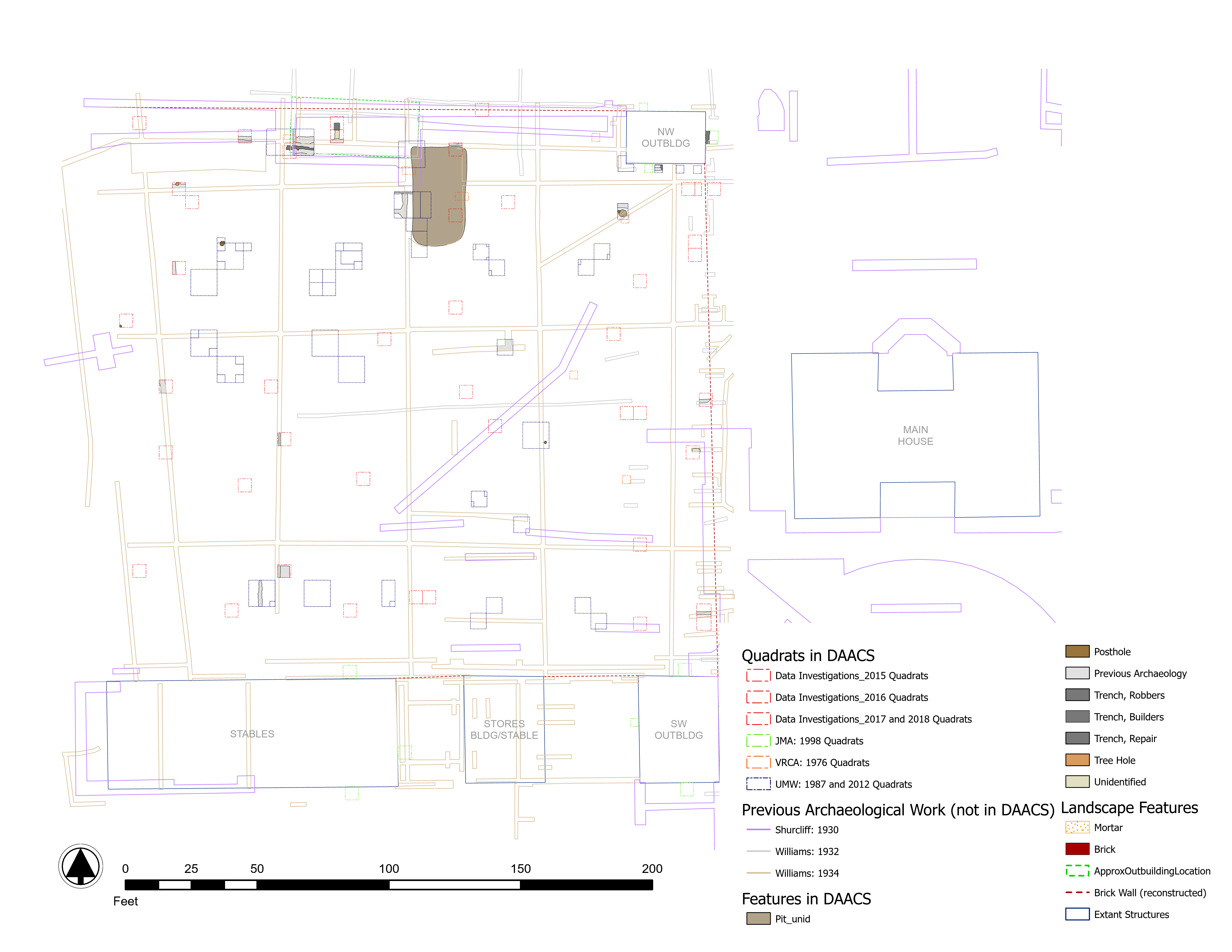 Between 1930 and 2000, four separate archaeological campaigns sought information on the various uses of the West Yard. These investigations found that restoration activities had largely transformed the area into a plowzone site although there was subsurface evidence of intact deposits. Notable findings include the robbed remains of a brick foundation as well as a large rectangular pit feature. A fifth archaeological season in the West Yard is being conducted by DATA Investigations to address some spatial gaps in the previous work. Archaeological data recovered from this research between 2015-2017 is also included in DAACS.