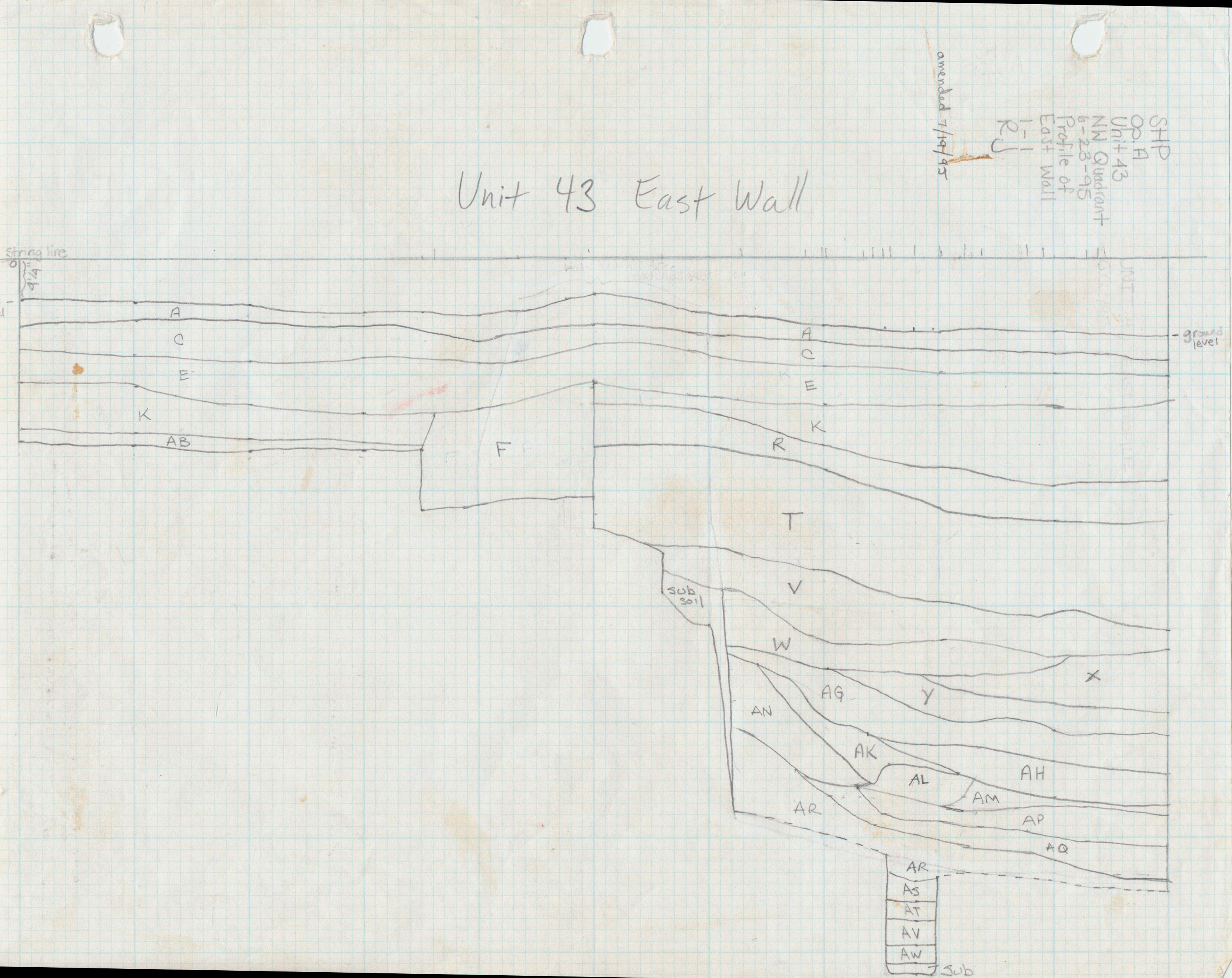 A major pit feature, Feature 01, is an exception to the basic stratigraphy described above. A full description of the feature is provided in the Background. Due to the complexity of the feature, a Harris Matrix is provided by DAACS that summarizes stratigraphic relationships among excavated contexts and groups of contexts that excavators and DAACS staff have identified as part of the same stratigraphic groups within Feature 01. Though Sanford and his field school students drew the east profile of Feature 01 outlining the stratigraphy between Units 33, 41, 42, and 43 at the end of its excavation, the drawings were not located at the time of reanalysis. As a result, only five stratigraphic groups were assigned by DAACSS based on information provided by the field records combined with photographs of the east profile: SG01, SG02, SG03, SG04, and SG05. Each of the stratigraphic groups represents a fill layer within Feature 01. Note that stratigraphic layers are numbered from the top down, beginning with SG01.