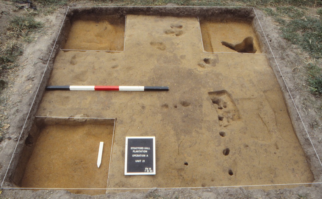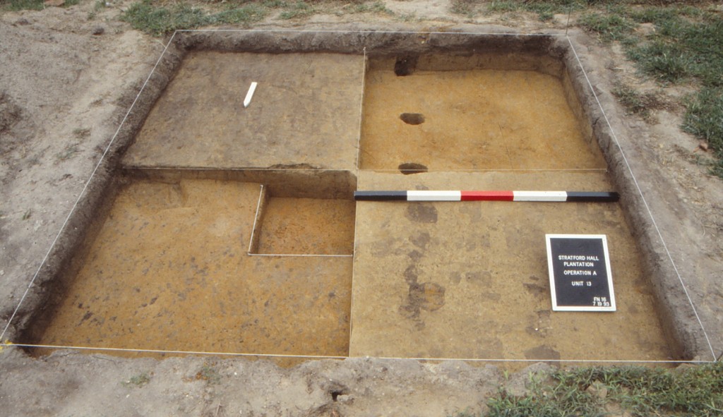 In the Spring of 1976, the Virginia Research Center for Archaeology (VRCA) was contracted to conduct a survey of the entire Stratford Plantation to create a catalog of archaeological resources. Survey fieldwork was carried out in three phases. Phase I consisted of surface inspection of plowed fields at 15-to-20 foot intervals. Areas under vegetation, pasture, and woodland were subsurface tested with shovel test pits (STPs) roughly placed on 20-foot centers (Neiman 1979:36).