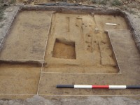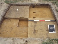 This brick pier, measuring 1.6 feet east-west and 2.3 feet north-south (Figure 4), was composed of hand made compass bricks, which were likely leftovers from constructing a well on the property, and appears to follow the same orientation as the main house and other outbuildings. The pier was constructed within a linear feature that may have been a planned partition wall, and suggests that the plans for this building may have changed during construction. The association of this brick pier, several post holes, and the linear trench, with the north wall brings into question the