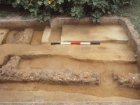 Beyond its disturbed context, Sanford noted two main qualities that distinguish this particular outbuilding (Sanford n.d.:Chapter 3, pages 14-15). One is its considerable size, with the long rectangular format signaling that the structure was not intended as a standard smokehouse, dairy, or other small service building. The completely robbed nature of its original brick foundation (Figure 11) defines the second quality. This brickwork was removed down to the clay subsoil beneath the foundation, and then leftover broken brick and mortar rubble was thrown back into the foundation trench, leaving a wavering “footprint” that delineated the structure’s outline below ground. The extensive degree of demolition infers that the structure’s razing was intended to prepare this area for a forthcoming, alternative land use. Plow scars recorded both within and outside the building’s limits provide some evidence of this land use, in that the plowing denoted either a shift to agricultural activity or a landscaping treatment that leveled the area for some other purpose in the late eighteenth or early nineteenth century. The disturbed condition of the vicinity prevented defining this later purpose.