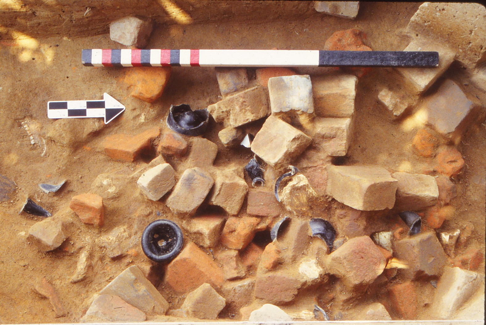 Sanford’s review of Feature 01’s elements and stratigraphy led him to differentiate four main periods of activity, ranging from initial use to final backfilling (Sanford n.d.: Chapter 3, pages 8-12). Modern, thin layers above the feature correspond to the restoration period and more recent activities, but do contain important dating evidence. Domestic and architectural artifacts of the late-eighteenth and early-nineteenth centuries, that is, of the same variety and occupation span seen throughout the West Yard, occur within the layers above the borrow pit and thus indirectly date its use and backfilling to a period prior to about 1770.