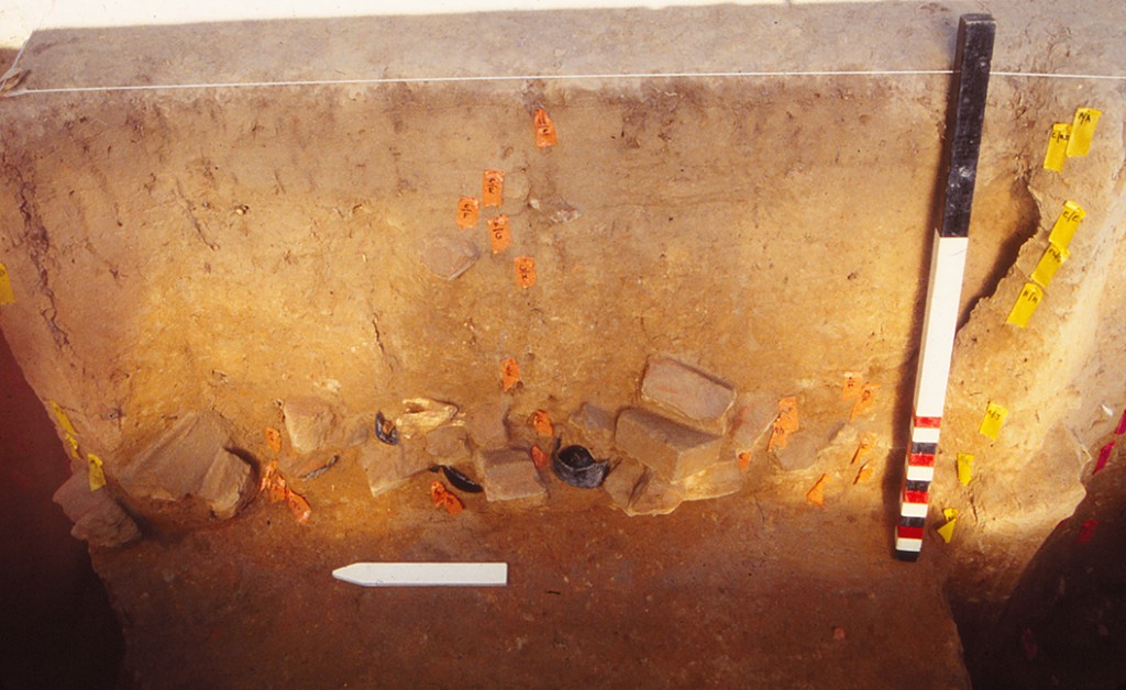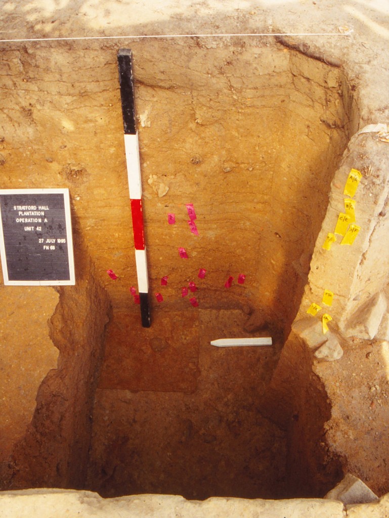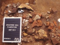 Overall, Sanford argues that the stratigraphic sequences within and on top of the borrow pit feature provide some of the best evidence at Stratford for the regular pace of landscape change that took place on this plantation between ca. 1750 and 1800. The larger shift from a place of construction activity (brick-making) to a work yard encompasses both a series of minor changes in land use, but also the significant erection of at least five outbuildings that bordered the service yard. The same fills of the borrow pit also should contain a significant body of landscape information with respect to botanical evidence. The dense clays that sealed the feature likely enhanced the degree of organic preservation within the lower deposits, and pollen and phytolith studies would provide a valuable index of the plantation’s plant environment and its changing nature.