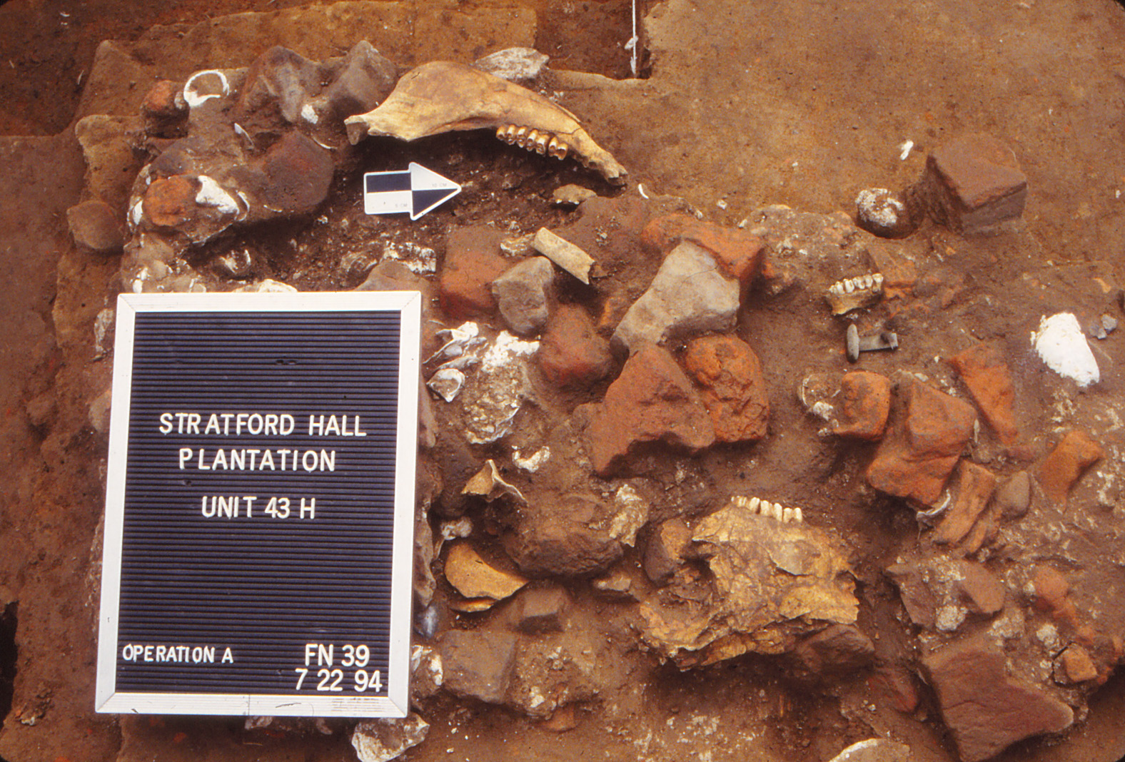 First identified during the 1930s archaeological campaigns in the area that became the West Yard, this large structure formerly comprised the northwestern segment of the outbuildings that surrounded the Great House’s western yard. The remains of the structure primarily consisted of a robbed builders’ trench (F10, Figure 9). The location of the southeast corner of the building above the large pit indicates that the building’s construction came after the infilling of the pit. Discussed below, archaeological evidence indicates the building’s demise occurred in the late-eighteenth century. Thus, for at least a few decades, this outbuilding represented a major component of the site and an important landscape feature during the Lee ownership period.