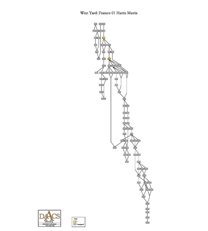 This Harris Matrix is based on data on stratigraphic relationships recorded among contexts in the DAACS database for Feature 01 at the West yard. It was drawn with the ArchEd application. See http://www.ads.tuwien.ac.at/arched/index.html.