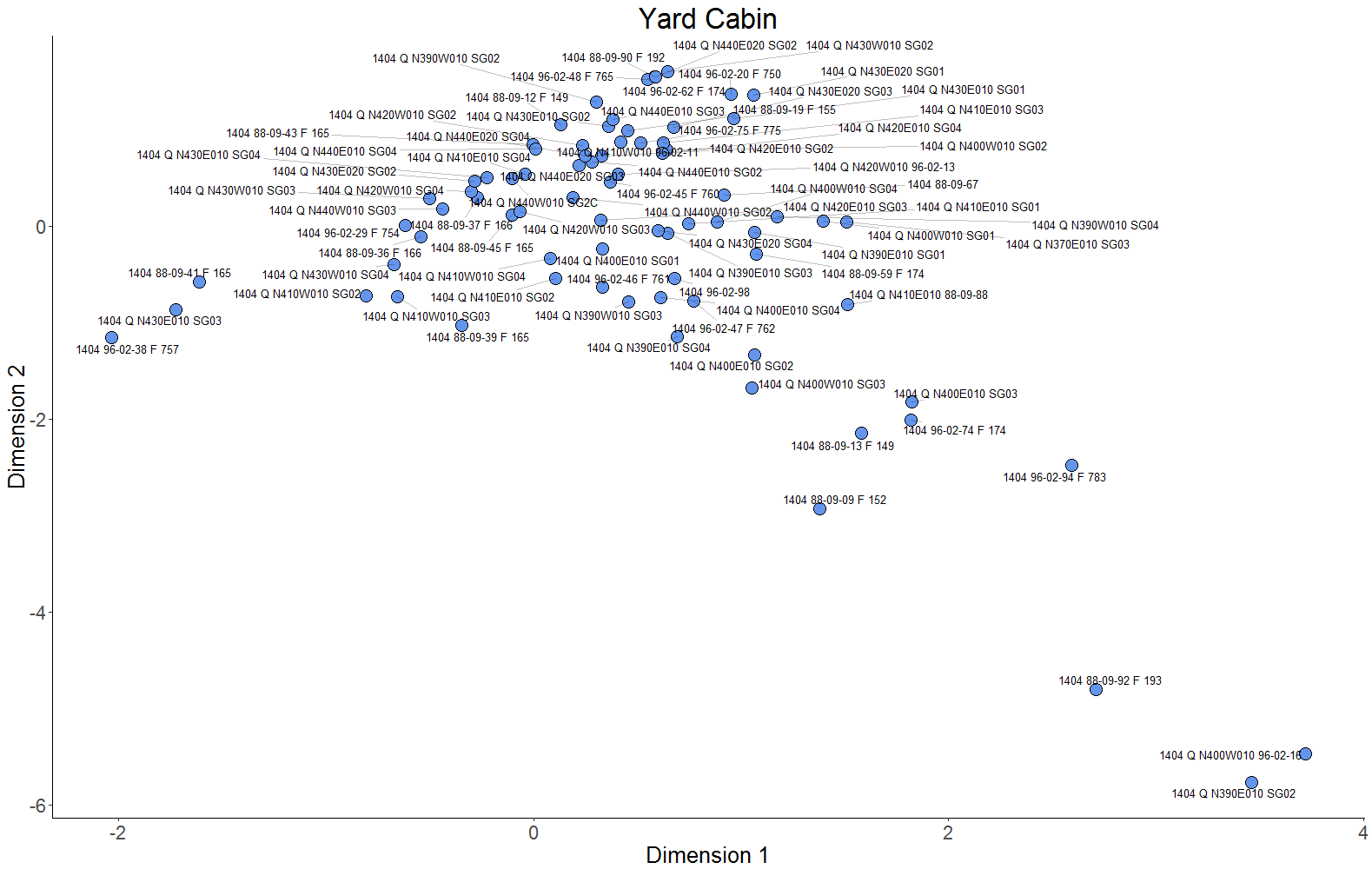 All of the R code used in this analysis was written within the domain of the R Core Team at the R Foundation for Statistical Computing, Vienna, Austria (2014). The correspondence analysis for Yard Cabin was conducted by Lynsey Bates.