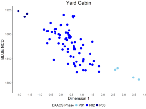 DAACS Phases are groups of assemblages that have similar correspondence-analysis scores, similar MCDs, or both, and are therefore inferred to be broadly contemporary. Phases have a P-prefix that precedes the phase number (e.g., P01 equals Phase 1). Based on the dips in ceramic counts observed in a histogram of Dimension 1 scores, where the vertical axis measures ceramic assemblage size, we divided the Yard Cabin into three occupational phases (Figures 4 and 5).