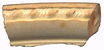 This molded band is seen most often on early molded refined wares like Creamware. A chain of solid raised ovals oriented on a diagonal that are separated by two thin diagonal lines characterizes Bead and Reel 02. Similar to Bead and Reel 01. The key differences between these two bands are the size of the beads and lozenges and the fact that Bead and Reel 02 is meant to look like a twisted cable or rope.  The beads on Bead and Reel 01 are more circular and pronounced.