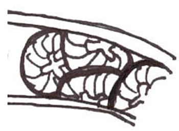 This Botanical Band consists of “wheels” of flowers that overlap. Each “flower wheel” has a four-“leaved” center from which radiates many thin, curved lines. May be seen with a large, distinct chrysanthemum bloom, similar to Botanical Band 17, overlapping the “wheels.” The example was seen on overglaze Chinese porcelain.