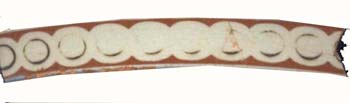 Circle Band 1 is an inlaid slip band that consists of large connected circles that have a smaller, dark central circle. This band initially cuts into the slipped vessel with a roulette tool. It is then slipped again with a different color and that slip is cut away. We record the final decorative treatment, which results in inlaid slip.