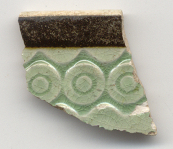 This band is similar to Circle Band 07. The central element is a band of connected circles with smaller circles inside them. A band of offset half-circles is attached to the top and bottom of the central band, forming the illusion of a scallop band above and below it. The example is rouletted.