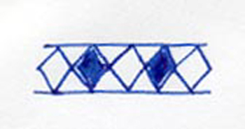 Like Diamond Band 01, this band consists of a single row of repeated, linked molded diamonds. However, the diamonds on this band alternate between solid diamonds and hollow diamonds. This molded diamond string is bound on either side by raised, molded plain bands.