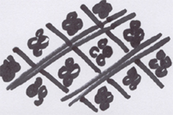 This decoration is a variation of the classic molded Dot/Diaper pattern. It has four raised dots in the center of a double banded diamond or crosshatch (the diaper).