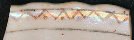 Dogtooth Band 3 is characterized by a saw-tooth band that has dots between the “teeth.” This design may or may not have a lower plain band. It is often painted along a scalloped edge.
