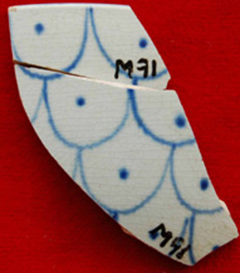 Fish Roe 01 is characterized by overlapping and tiered painted scallops that give the appearance of fish scales. A single dot is painted inside of each scallop. Unlike Fish Roe Band 01, it is not contained by single bands on either side.This element generally covers the entire vessel.
