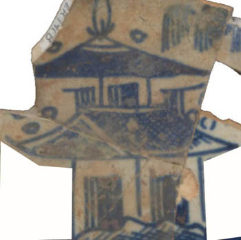 House elements are highly variable and are characterized by many attributes, ranging from windows, doors and multiple peaked roofs with finials.  The image demonstrates one example of a house seen on both porcelains and earthenwares.