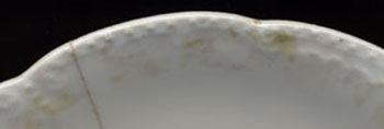 Characterized by a scalloped edge with a row of dots below the rim. The dots are molded on this example, but can also be painted.