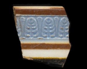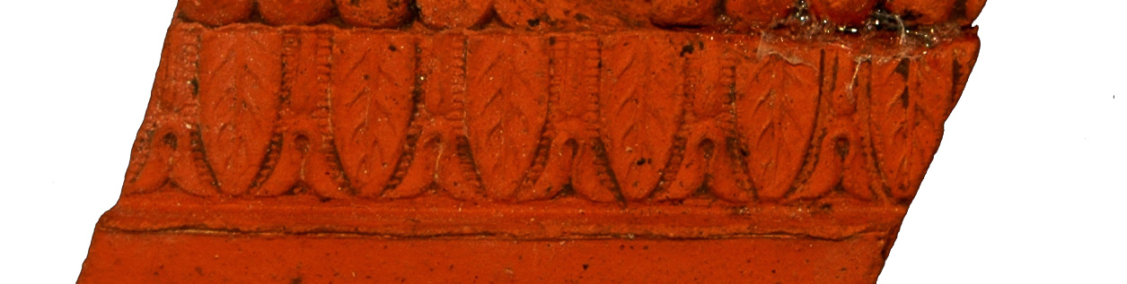 Composed of a row of impressed leaf-shaped pieces, each with impressed, vertical connected chevrons like “veins” of a leaf.