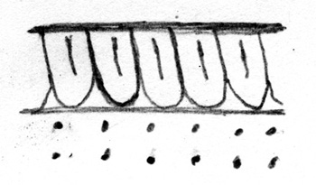 Scallop Band 14 is a combination of Scallop Band 01 and Scallop Band 03: it is characterized by a continuous band of elongated half-circles with straight lines extending in the middle of them, enclosed between two plain bands. Directly outside the enclosed band and underneath each rounded portion of the half-circle, sit two separate dots painted one on top of the other (in a vertical formation). This band is most often seen on overglazed Chinese porcelain.